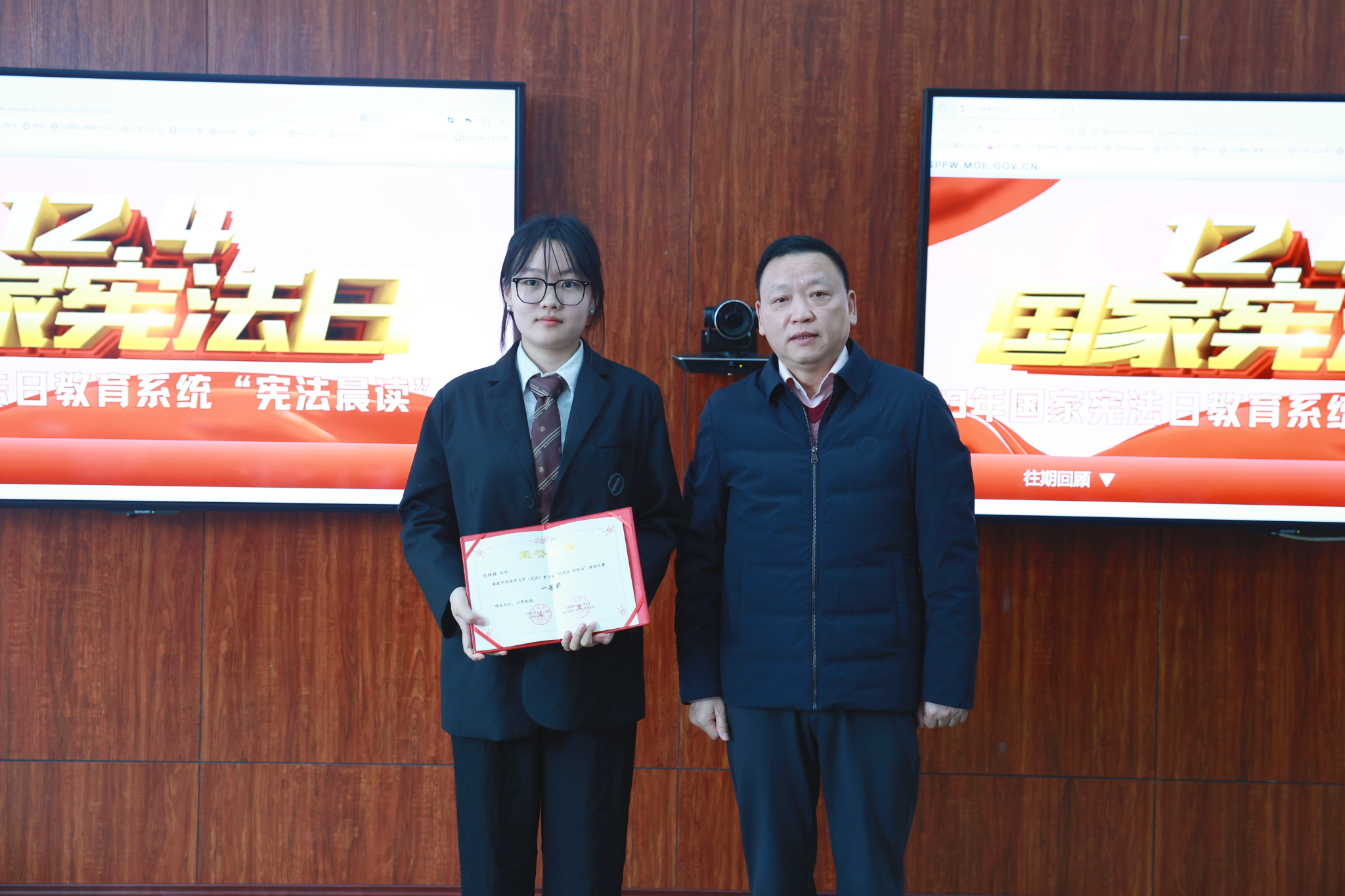 在学校“宪法晨读”中,米兰“学宪法 讲宪法”演讲比赛第一名同学进行了精彩的展演;校党委副书记王林清为学校第十届“学宪法 讲宪法”演讲比赛活动获奖者颁奖。