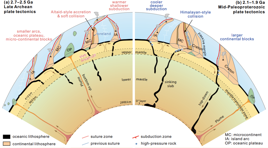 此外,研究团队通过整合构造、碎屑金红石/锆石和变质大数据等多方面证据,约束了新太古代和古元古代明显不同的变形和变质作用样式,认为该样式差异可能是新太古代和古元古代造山作用和板块构造样式发生转变的响应,即太古宙以阿尔泰型弧陆增生—软碰撞、缺乏高压变质作用和形成超级克拉通等为特征,而古元古代广泛发育喜马拉雅型陆陆碰撞,出现冷俯冲、全球性超大陆聚合等为特征(图2)。研究团队进一步提出造山带隆升—剥蚀及硅酸盐风化过程可能对古元古代早期水圈、大气圈和生物圈产生了重要影响,而有机物埋藏、沉积物俯冲等过程又进一步促使古元古代造山作用样式的转变,体现了固体—表生圈层相互作用和协同演变的复杂地球系统演化观。