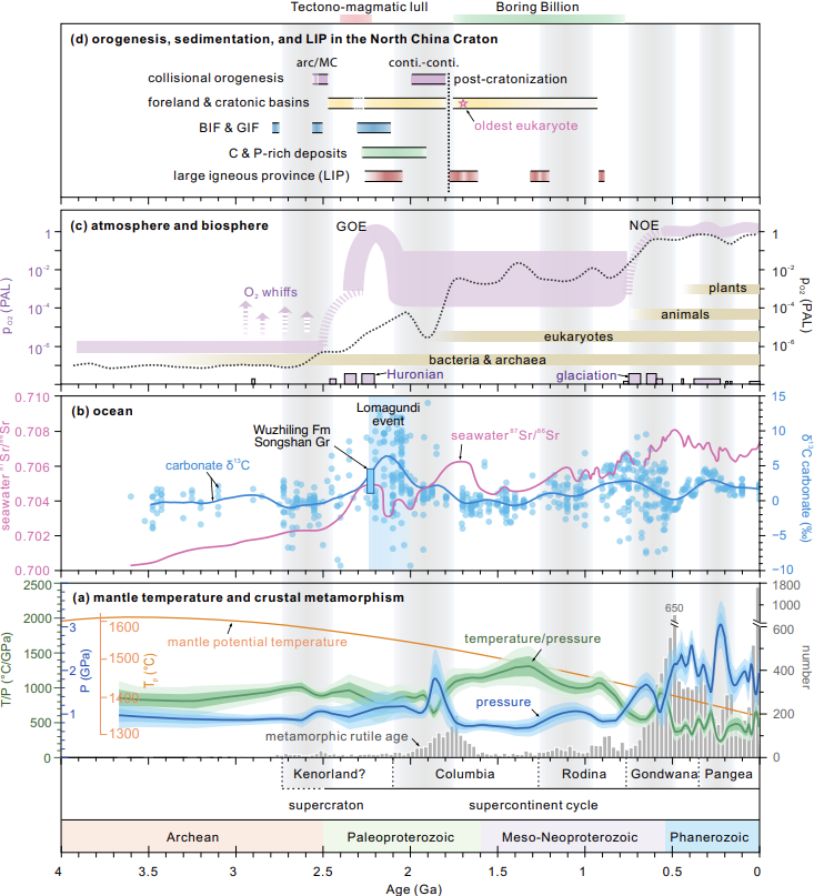 地球是已知唯一具有长英质大陆地壳、板块构造和生命的宜居星球,其现今的宜居性由岩石圈、水圈、大气圈和生物圈之间的相互作用维持。新太古代到古元古代是地球内部和表生系统最具变革性的关键转折期之一,见证了陆地广泛浮出海平面、克拉通化、超级克拉通—超大陆旋回和全球板块构造建立等固体圈层演变,以及大规模含铁建造、石墨—磷成矿、休伦冰期、大氧化事件和多细胞真核生物出现等表生圈层变化(图1)。虽然目前普遍认可全球性板块构造至少在新太古代到古元古代已经存在,但此时板块构造样式,尤其是造山作用样式与现代俯冲—碰撞体系有何差异,以及固体和表生圈层之间的反馈机制等前沿热点科学问题,仍需进一步地质约束。