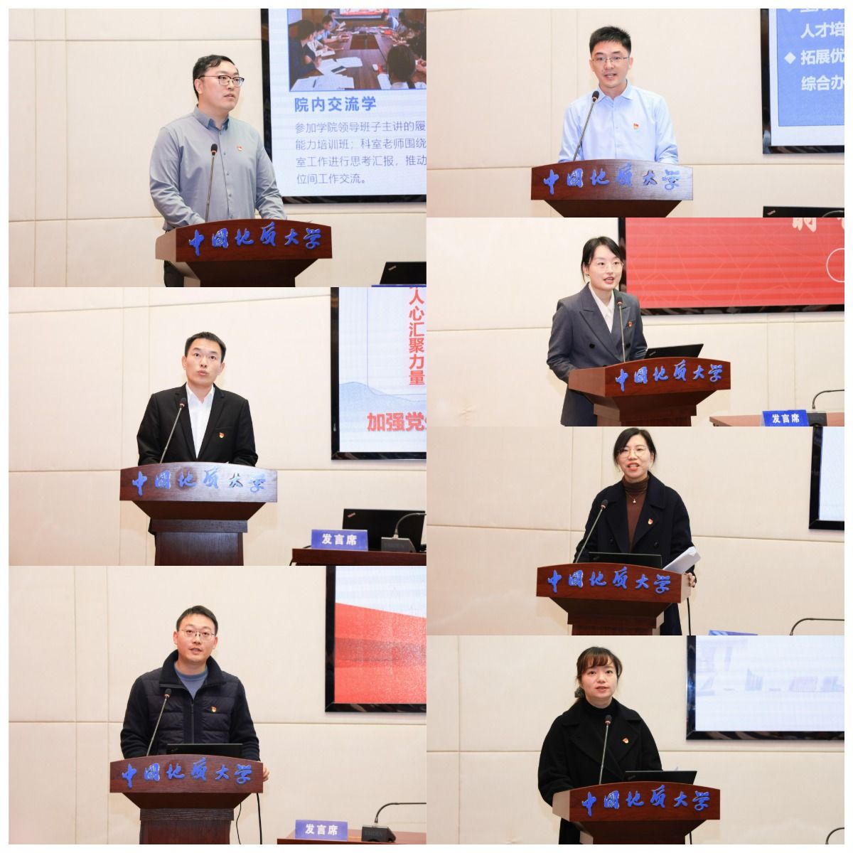 7位青年干部代表围绕“学习党代会精神 立足岗位建新功”作主题发言。资源学院吴超以《聚焦大局定位 立足全局作为 努力服务资源能源领域一流研究型学院建设》为题,分享了作为综合办公室工作人员勤学善思,在服务学院事业发展中担当作为的感悟;高等研究院于洋以《学习党代会精神 以高质量党建引领科技平台高质量发展》为题,分享了自己在工作中涵养党务红心,服务科技创新的思考;工程学院周克清以《教育强国 “双带头人”教师党支部书记何为?》为题,分享了作为一名教师党支部书记如何通过强化政治引领,发挥好党建引领学科发展和人才培养作用的实践与探索;公共管理学院李姝慧以《时代·实践·育人》为题,分享了对学校紧跟时代课题践行办学使命的认识与思考;远程与继续教育学院刘妍慧以《踔厉奋发新征程 勇毅前行谱新篇》为题,分享了紧扣社会发展需求,躬身服务新时代继续教育发展的思考与决心;学校办公室王珩以《学思想 促行动 建新功》为题,分享了对青年干部如何运用系统思维、主动革新观念,以实际行动助力学校事业高质量发展的认识与感悟;后勤保障部江琼以《扎根“希望田野” 积蓄“向阳力量” 走好学校后勤事业高质量发展的奋进之路》为题,分享了对如何认清形势、找准抓手路径、服务学校中心工作的理解与探索。