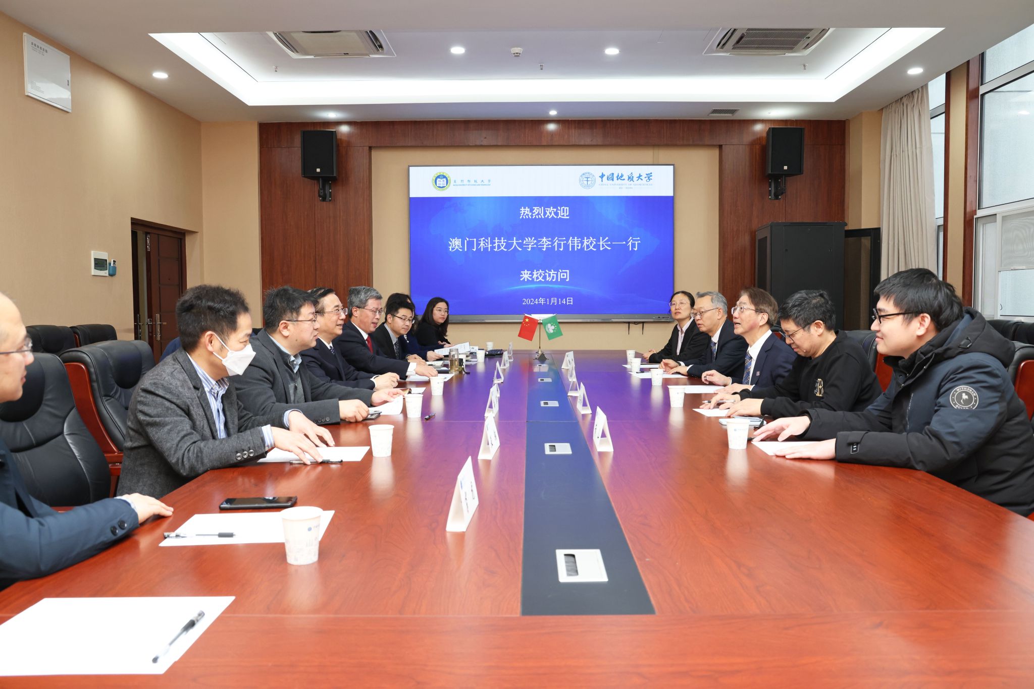 地大新闻网讯 (通讯员 张愫恒 摄影 孙彦钦)1月14日,澳门科技大学校长李行伟一行来校访问,举行合作协议签约仪式,并就两校未来合作议题进行座谈。米兰校长王焰新、副校长王华,双方相关单位代表出席签约仪式和座谈会。国际教育学院副院长范陆薇主持会议。