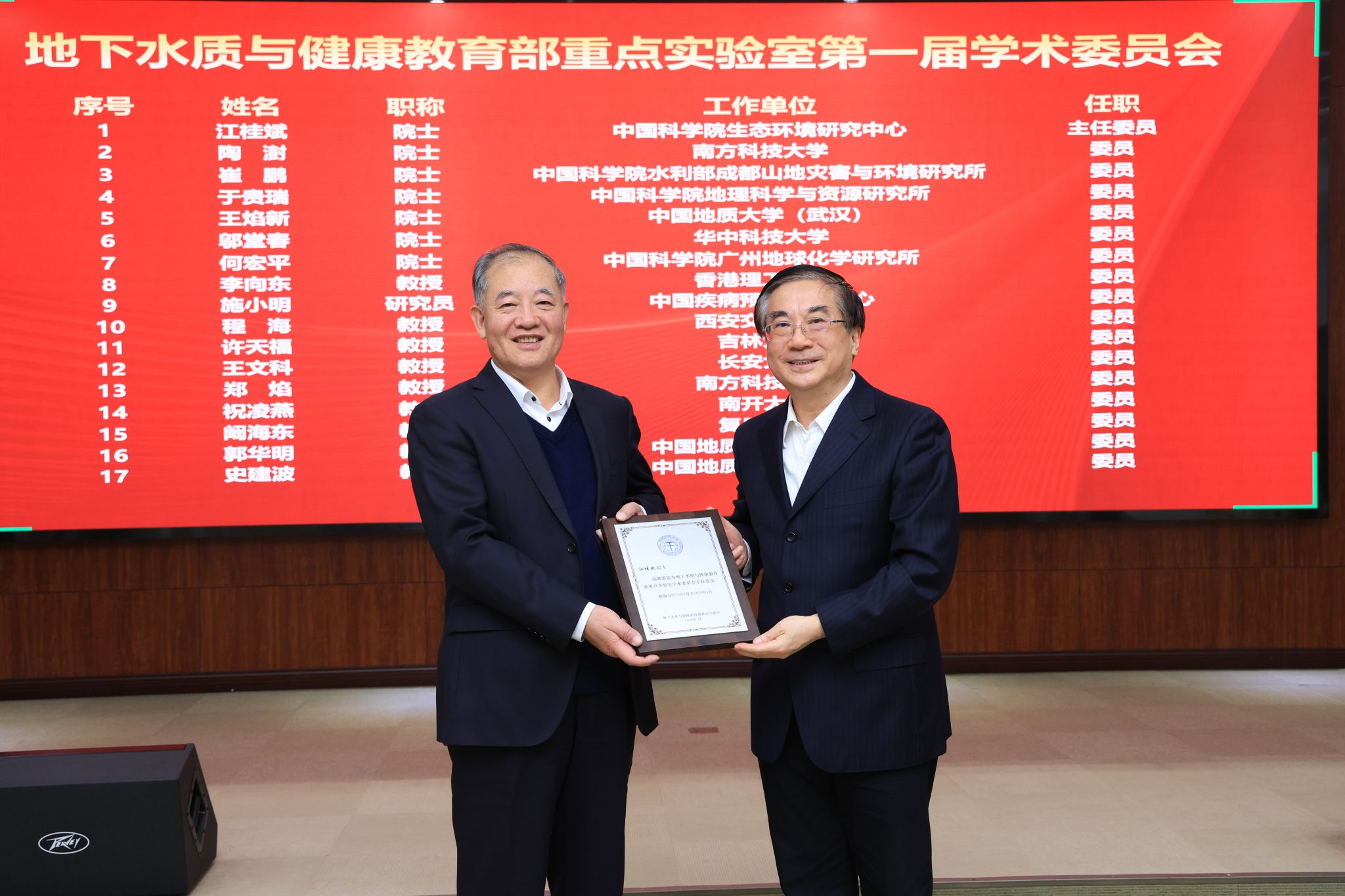 地大新闻网讯(通讯员 孙博文 邱文凯 摄影 王俊芳)1月14日,米兰地下水质与健康教育部重点实验室(以下简称“实验室”)揭牌仪式暨学术委员会会议在南望山校区举行。中国科学院生态环境研究中心江桂斌院士、中国科学院水利部成都山地灾害与环境研究所崔鹏院士、中国科学院地理科学与资源研究所于贵瑞院士、华中科技大学邬堂春院士、国家自然科学基金委地学部环境地球科学处处长刘羽及学术委员会委员出席,校长王焰新院士、副校长王力哲和学校相关职能部门负责人参加。高等研究院常务副院长章军锋主持会议。