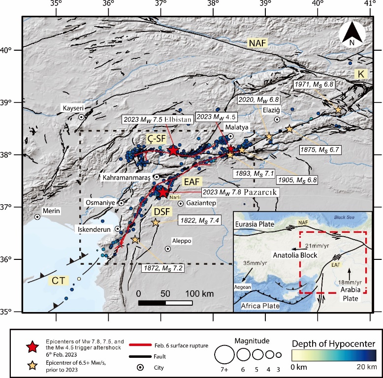 本次地震事件,是在北向运动的阿拉伯板块与欧亚板块碰撞、安纳托利亚板块侧向挤出这一构造背景下,死海断层带(DSF)和东安纳托利亚断层带(EAF)两条重要的转换型板块边界及其分支在板块构造运动的背景下共同活动导致的(图2)。