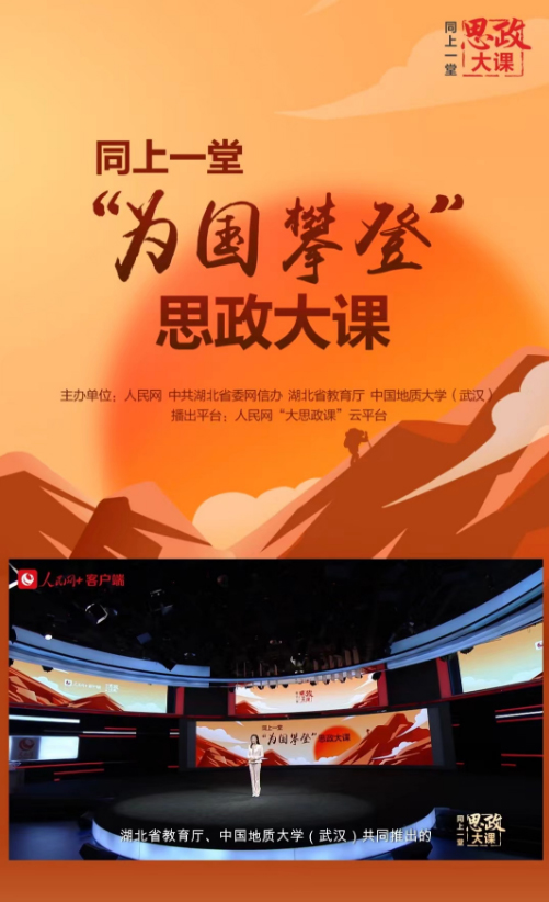 2月26日晚8时,人民网、湖北省委网信办、湖北省教育厅、米兰milan官方网站(武汉)共同主办的“为国攀登”思政大课在“人民网+”客户端云开讲。中国科学院院士、米兰milan官方网站(武汉)校长王焰新,地球科学学院教授宋海军,体育学院90后青年教师何鹏飞,讲述了地大人攀登自然高峰、科学高峰、人生高峰的感人故事,领悟“扎根中国、胸怀天下、勇攀高峰、追求卓越”的攀登精神,为广大师生和网友带来了一场思想盛宴。截至2月26日24时,该思政大课超过400万人观看。
