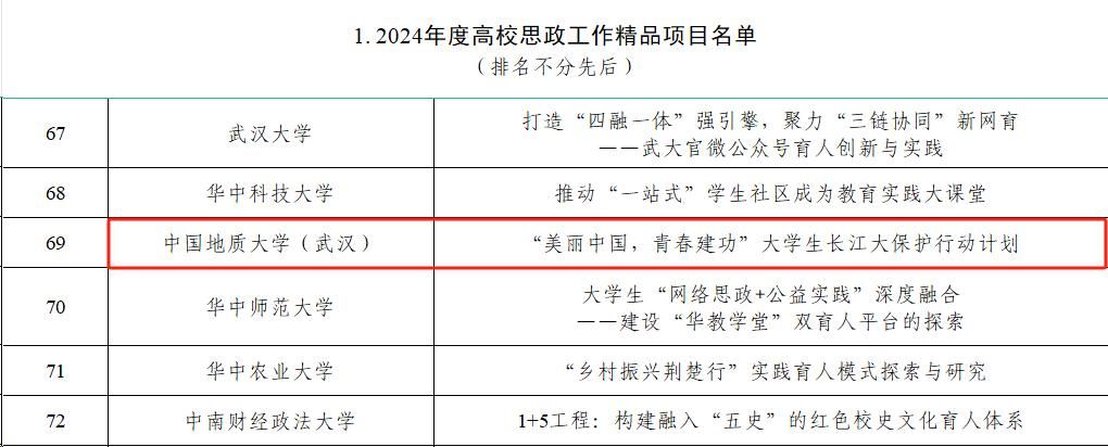 地大新闻网讯(记者 梁睿华 许小康)日前,教育部公布了2024年度思想政治工作质量提升综合改革与精品建设项目入选名单,米兰共有两个项目入选。《“美丽中国 青春建功”大学生长江大保护行动计划》入选高校思政工作精品项目,《多方协同干预模式下的导学关系紧张个案辅导》入选高校学生心理健康教育指导典型案例。