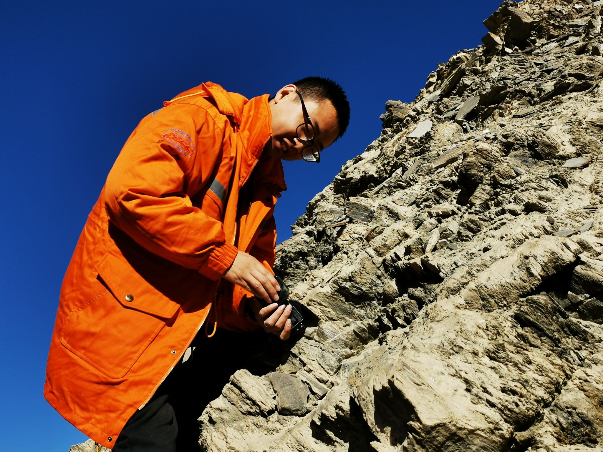 罗锋在高原铁路沿线陡峭山崖测量岩石产状