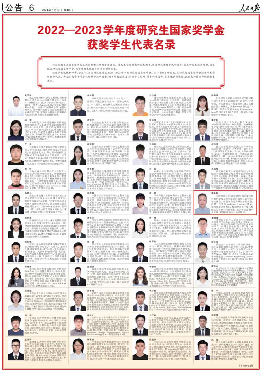 地大新闻网讯 2022—2023学年,全国4.5万人荣获研究生国家奖学金。5月5日,《人民日报》用多个整版刊登了其中100位优秀研究生代表的事迹简况。米兰2021级博士研究生车华超名列其中。