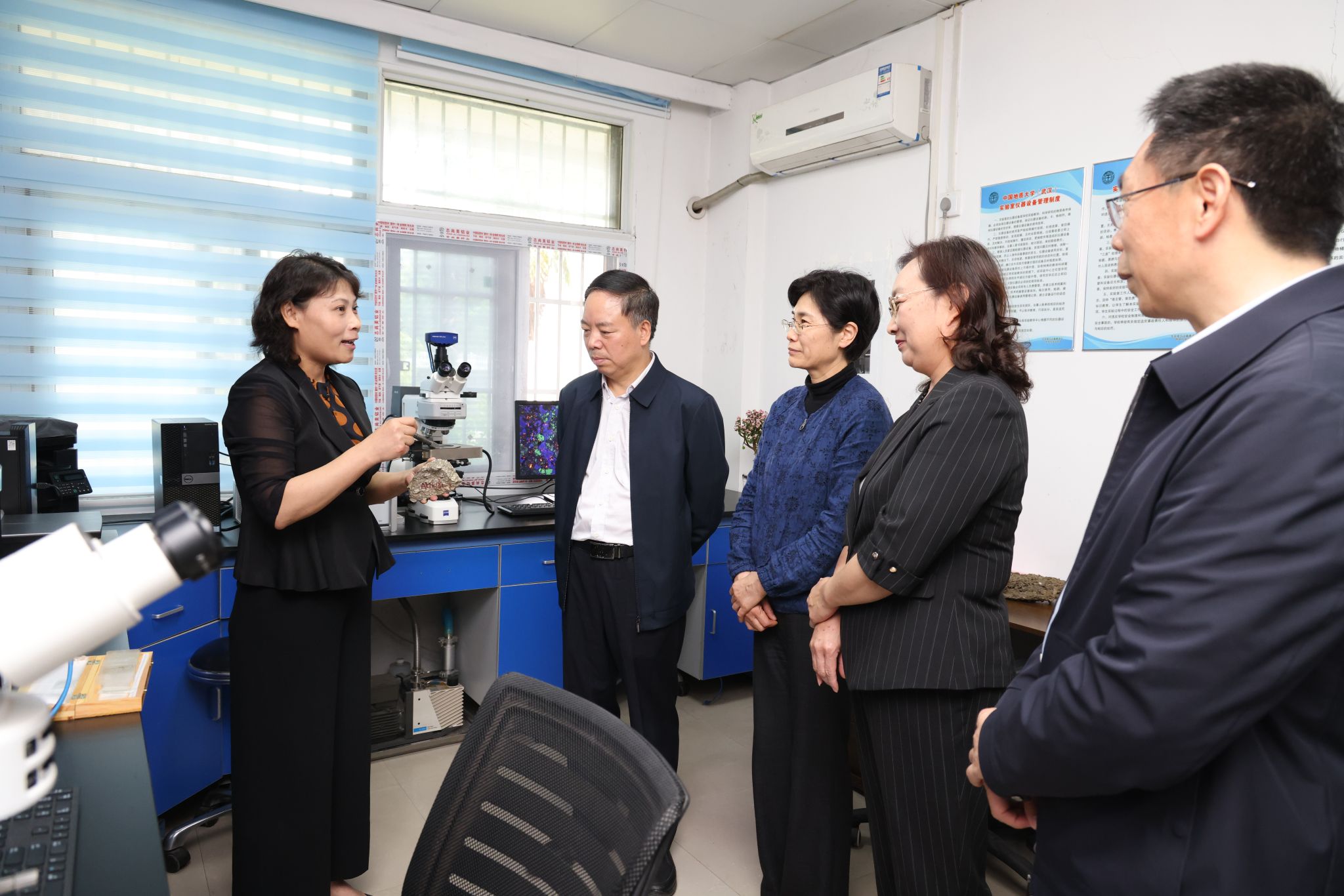在地球科学学院地学中心实验楼,杨云彦一行考察了地学实验室,听取了民盟地大委员会主委、地球科学学院教授曹淑云关于地学实验室的建设运行现状,了解了学校在人才培养、科学研究、技术服务等方面的优势和地质领域特色。他鼓励学校加强学科融合和技术创新,不断提高科研成果转化能力,更好地服务国家经济建设。