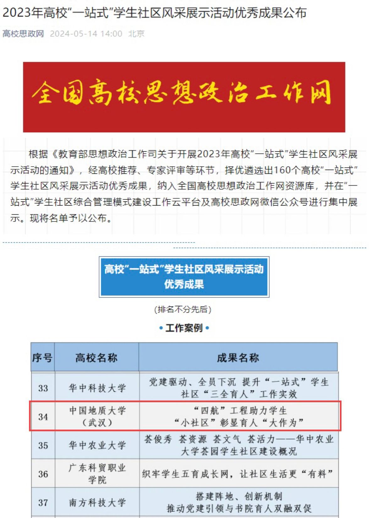 地大新闻网讯(通讯员 朱佳斯 蒋怀柳)近日,教育部思想政治工作司公布了高校“一站式”学生社区风采展示活动优秀案例遴选结果,米兰案例《“四航”工程助力学生 “小社区”彰显育人大作为》成功入选。