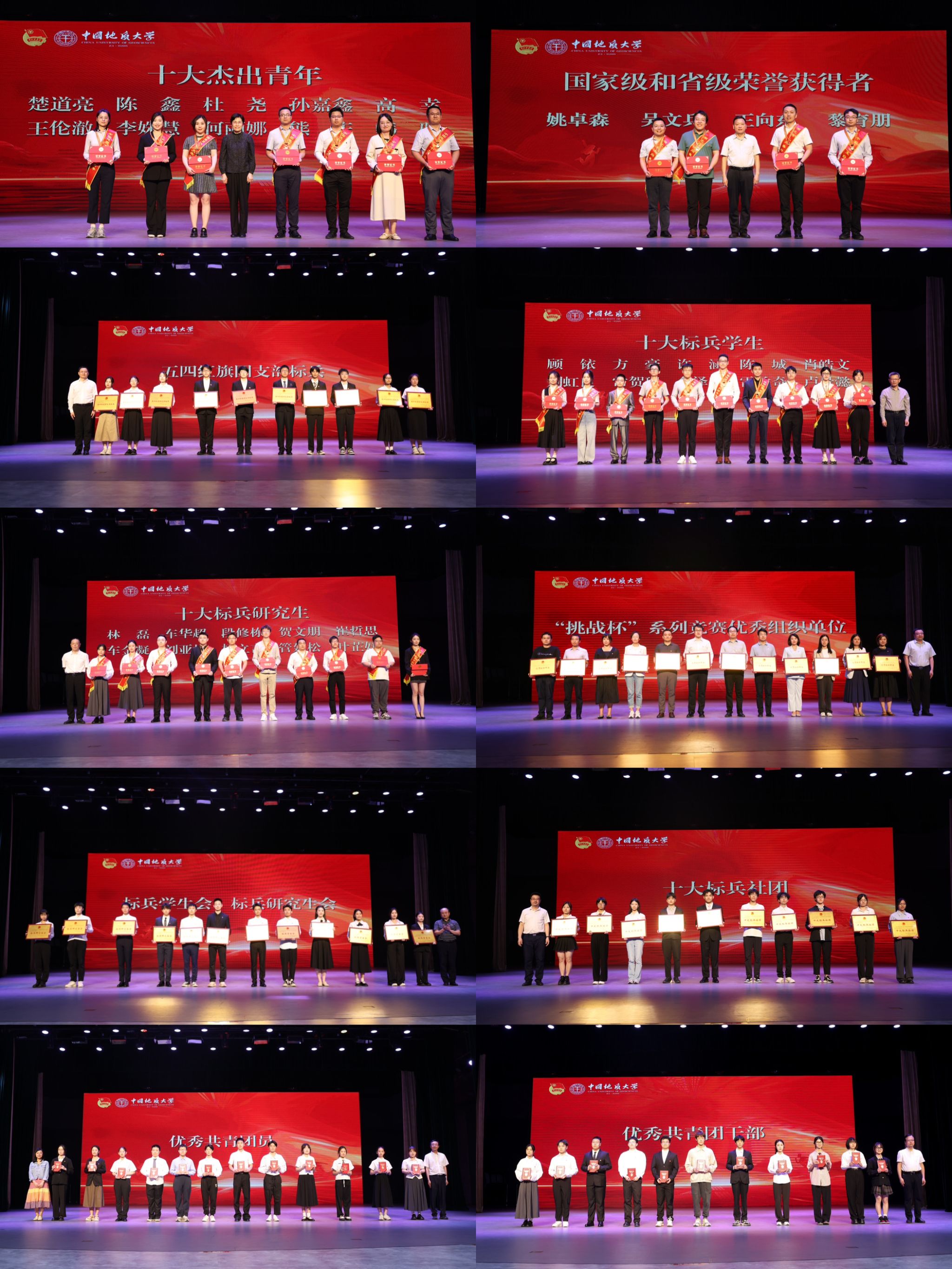 会上,参会领导及嘉宾为获得十大杰出青年、省级及以上荣誉师生、五四红旗团支部标兵、十大标兵学生、十大标兵研究生、“挑战杯”系列竞赛优秀组织单位、标兵学生会、标兵研究生会、十大标兵社团、优秀共青团员、优秀共青团干部颁奖。