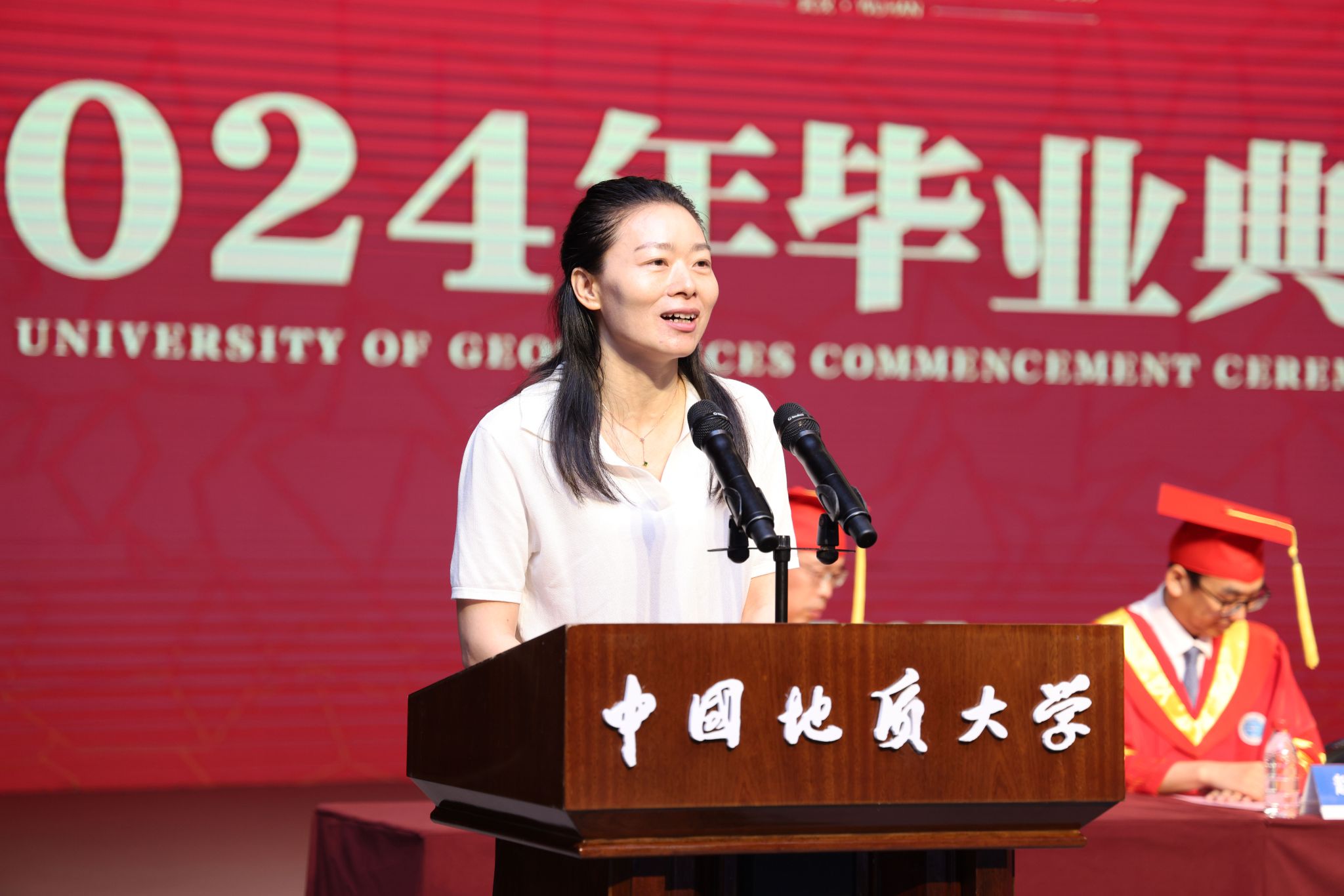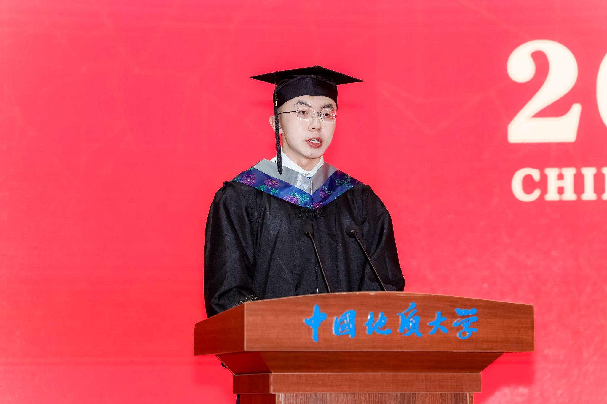 毕业研究生代表、资源学院矿产普查与勘探专业博士研究生苟启洋同学发言。他说,在地大求学十一载,母校赠与他“理想”“毅力”“责任”三件礼物,让他在追梦路上不断成长,在“地质报国”的理想道路上行稳致远,他将持续深耕页岩油气的研究领域,争做新时代能源强国的“硬核”青年学者。他祝愿所有毕业生都能成为追梦路上的“践行者”,逐梦路上的“坚守者”,圆梦路上的“担当者”。