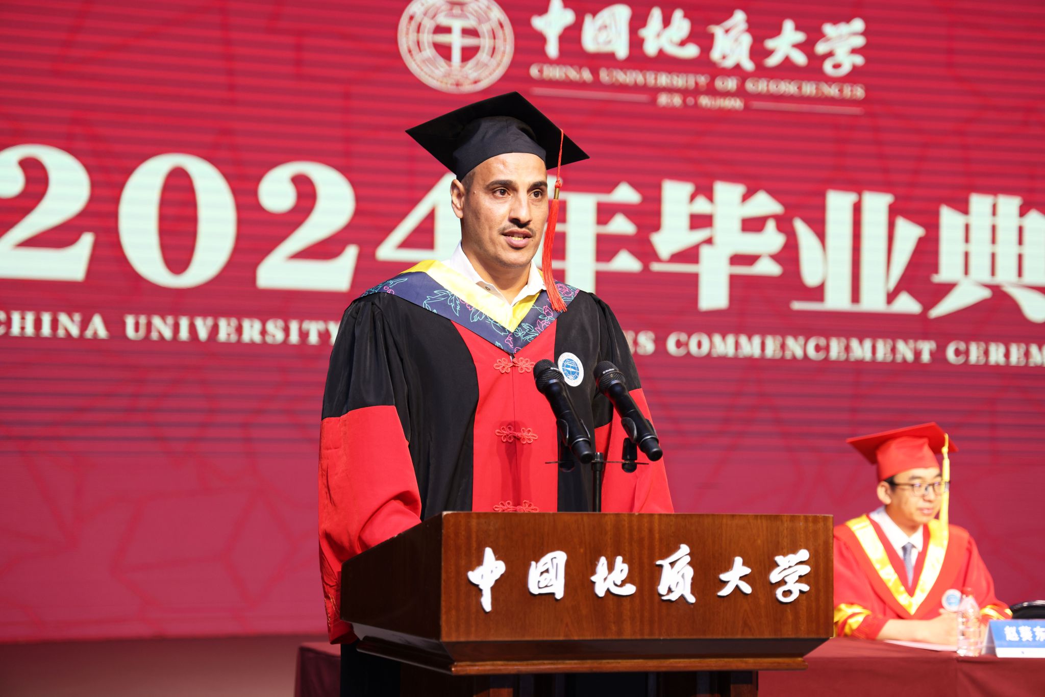 留学生代表、自动化学院控制科学与工程专业、也门籍博士研究生易傲松同学发言。作为获中国政府奖学金资助的留学生,他在地大学习生活八年,努力追求学术卓越,获得了博士学位,留下了难以磨灭的师生情谊,他用武汉话说“这八年我还真滴是那个事”。他表示,作为一名国际学生,将用实际行动讲好中国故事,讲好“一带一路”的大国传奇,为促进国际友谊和文化交流贡献自己的力量。