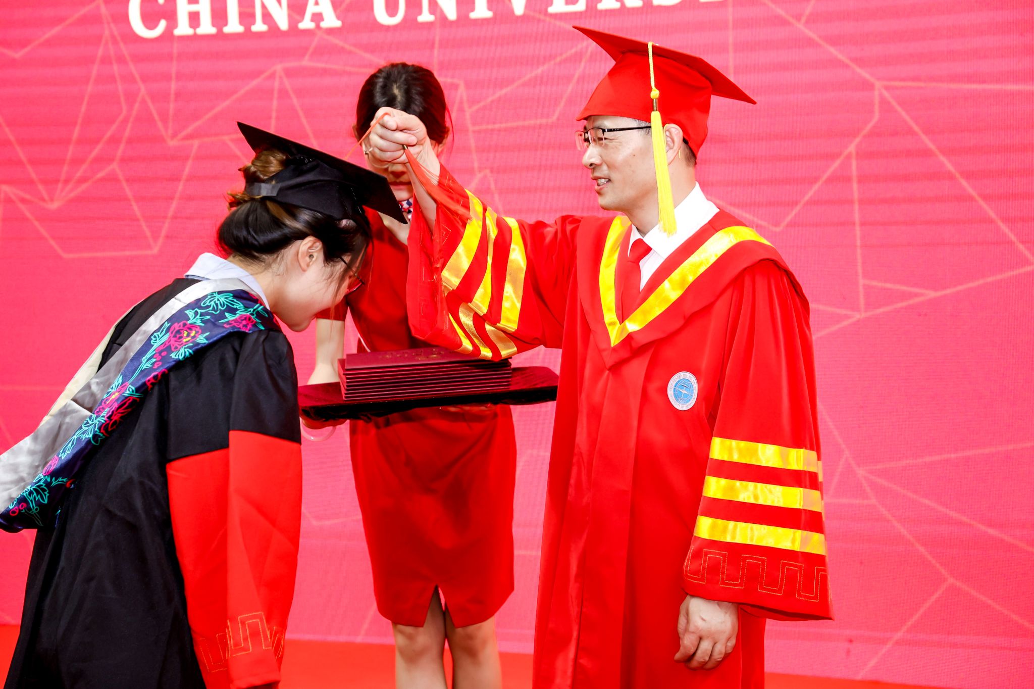 在毕业生学位授予仪式上,校领导、导师代表为2024届毕业生代表一一拨穗,并颁发毕业证书。