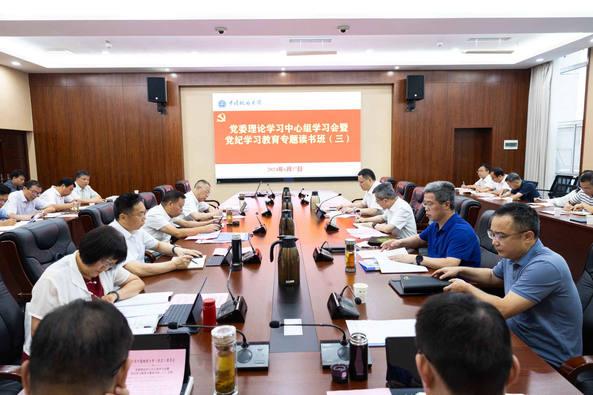 地大新闻网讯(记者 梁睿华 许小康)6月27日上午,学校党委理论学习中心组学习会暨第三期党纪学习教育读书班在南望山校区东区教学综合楼A701举行。党委理论学习中心组成员、相关单位主要负责同志参加会议。校党委书记刘杰主持会议。