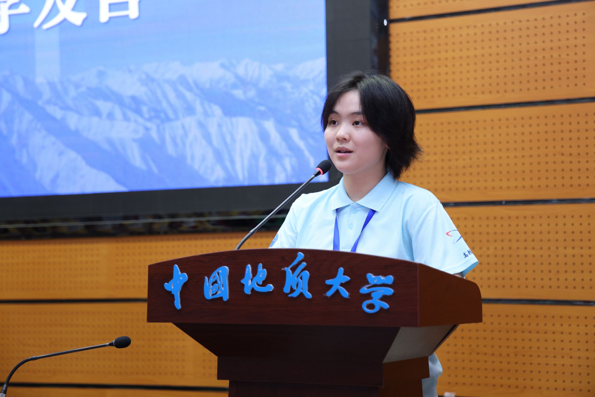 志愿者代表黄啟亮同学发言。他说,30名志愿者牢记“奉献、友爱、互助、进步”的志愿精神,将主动为每一位营员提供全方位的保障和服务,陪伴营员们感受地大精神和科学魅力。