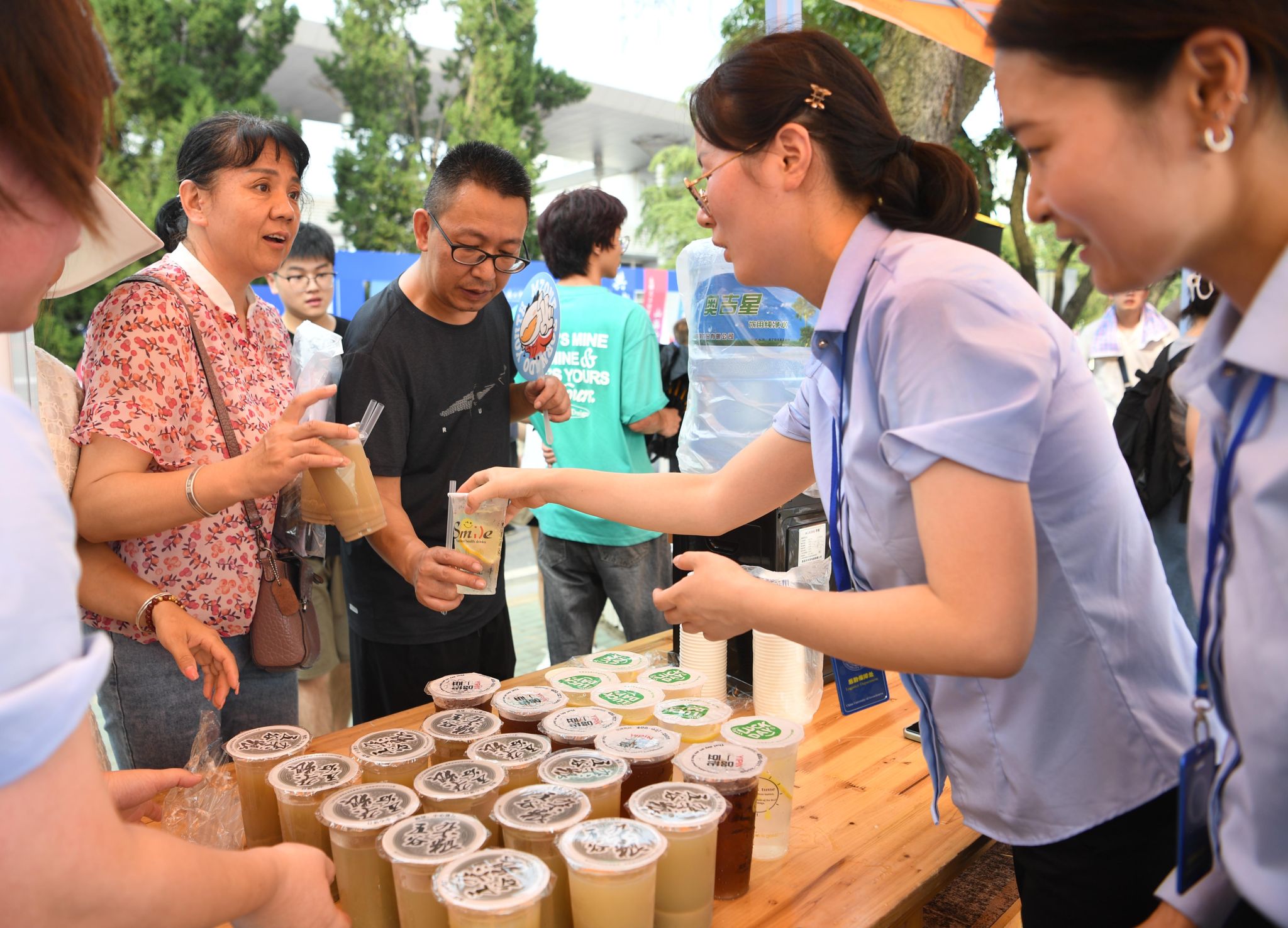 在免费饮品发放点,后勤保障部饮食服务中心的刘岩和同事们,共同参与了迎新送冷饮服务。她们表示,在炎炎夏日,为刚刚踏入大学校门的新生和家长们送上清凉的饮品,看到他们因为这份小小的关怀而露出的笑容,她和同事们的内心涌上一股满足和喜悦,也更加坚定了为师生服务、为学校贡献的信念。据介绍,现场一共准备了饮用纯净水、绿豆沙、酸梅汤、柠檬汁四类饮品,迎新期间不限量供应。