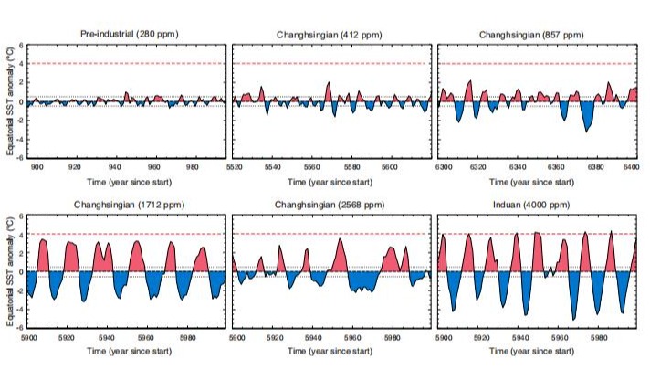 未来气候变暖是否会持续增强厄尔尼诺—南方涛动的强度和时间目前尚存激烈的争论,但厄尔尼诺经常导致森林退化、珊瑚白化以及鸟类和鱼类大量死亡。在二叠纪末的盘古地球,随着 pCO2 的增加,厄尔尼诺似乎变得越来越强。在2.5亿年前的二叠纪与三叠纪之交,厄尔尼诺-南方涛动随大气二氧化碳上升不断增强,因为厄尔尼诺现象导致海洋生物的灭绝滞后陆地灭绝约1到7万年,这在地质学上是一个很短的时间间隔,但在人类的时间尺度上却是一个令人震惊的时间范围。