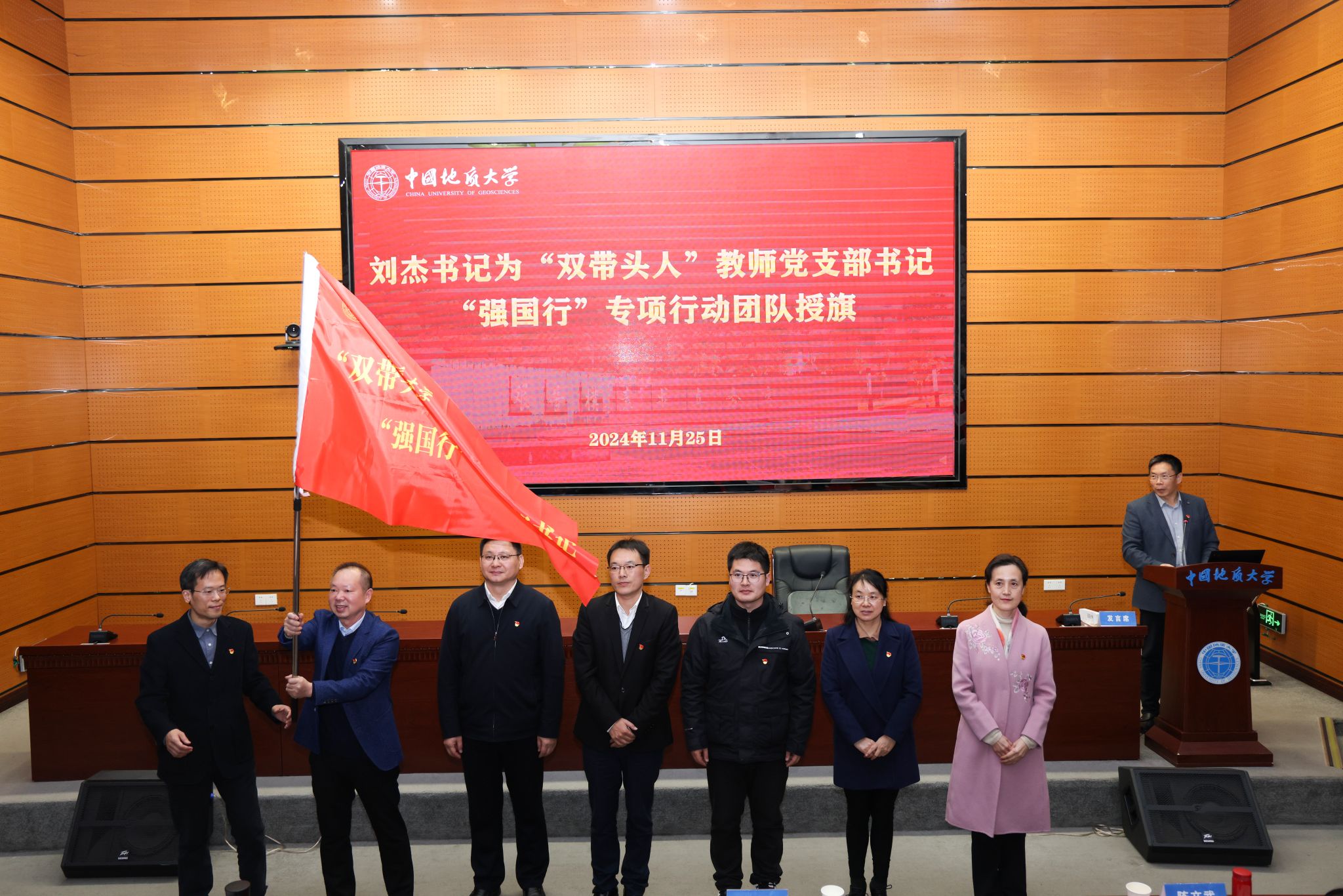 培训期间,刘杰为入选全国和湖北省“双带头人”教师党支部书记“强国行”专项行动团队的6个支部授旗。