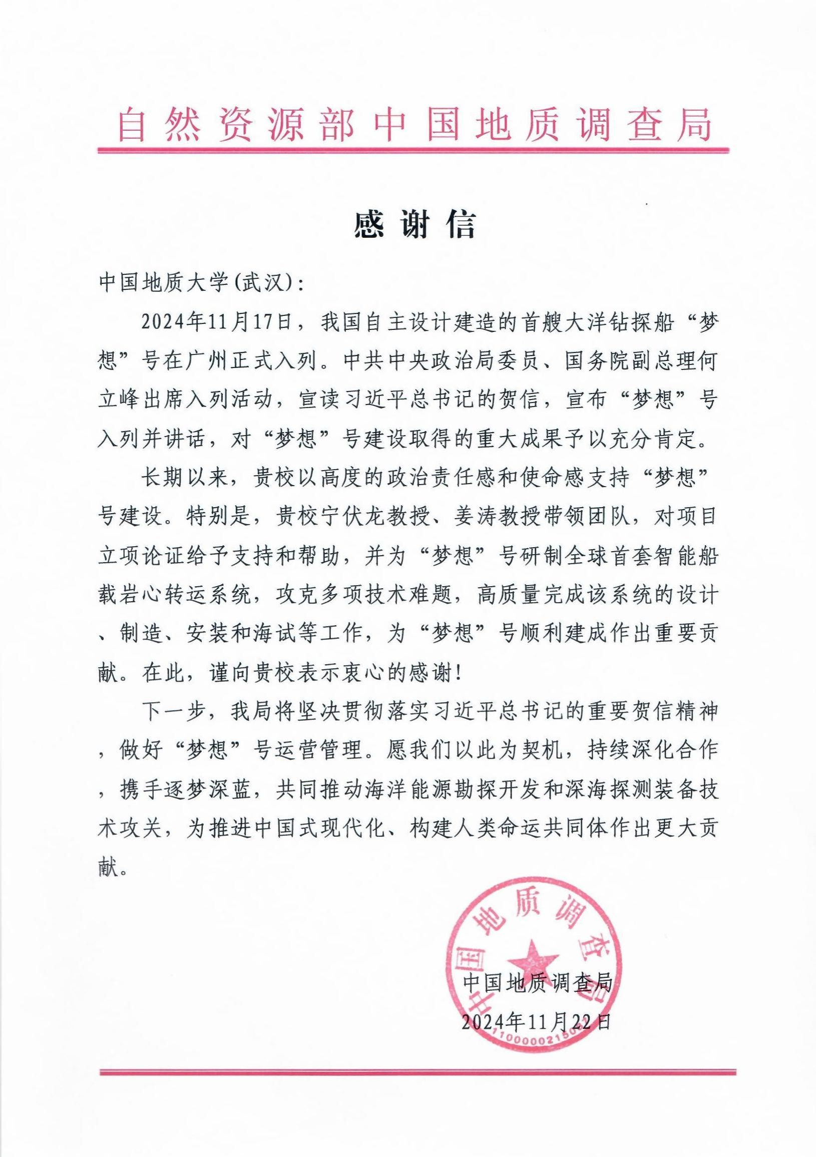 “梦想”号海试成功并正式入列,自然资源部中国地质调查局向米兰发来感谢信,对学校以高度的政治责任感和使命感支持“梦想”号建设表示感谢。
