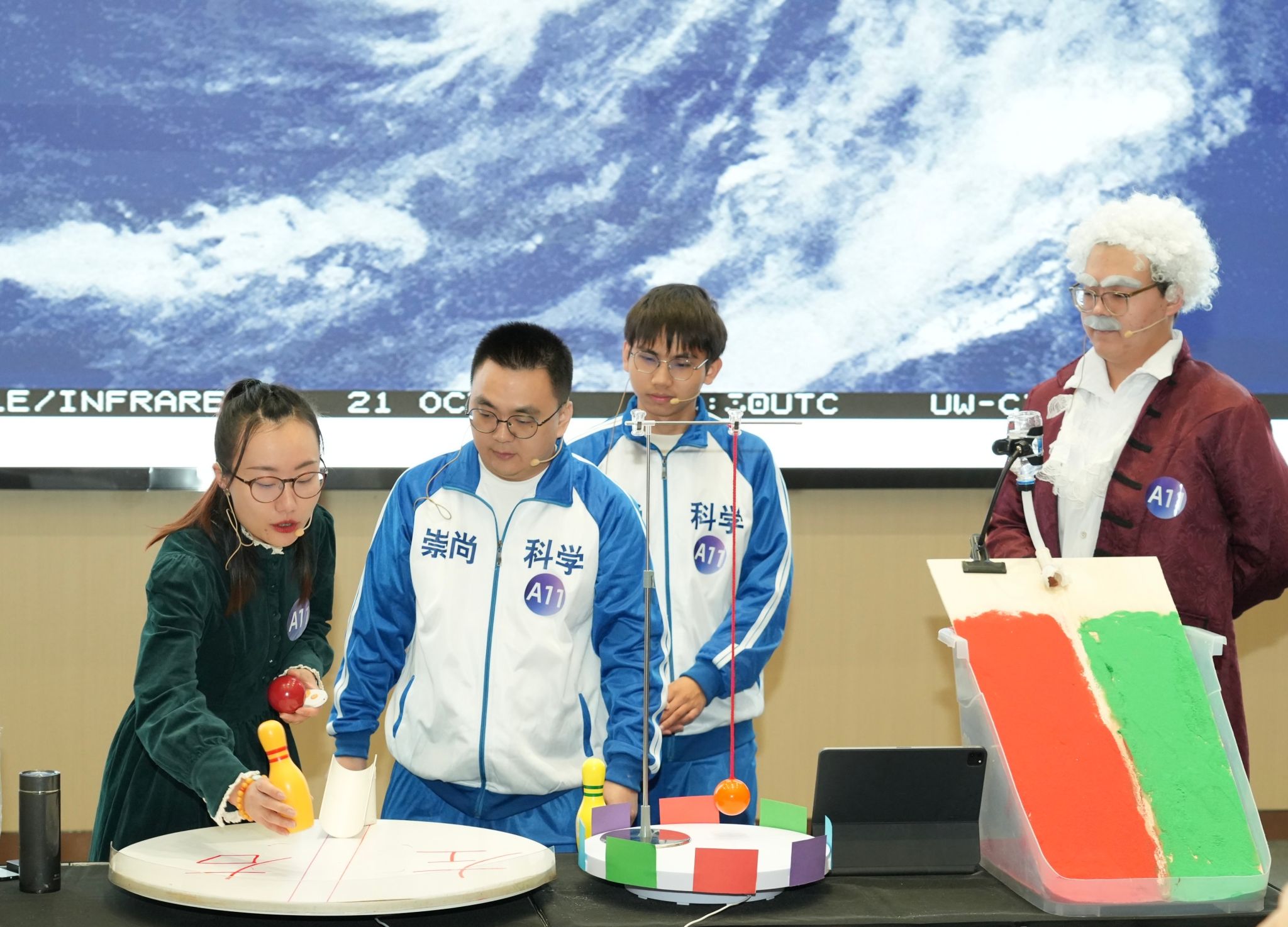 《玩转科氏力》以台风“贝碧嘉”登陆我国为背景,借助AI技术与数字人科学家展开了一场跨越时空的对话。展演巧妙设计了4个科学实验,以游戏化的形式深入浅出的感受到科氏力的作用及其在自然现象中的体现,揭示台风旋转背后隐藏的科学奥秘,展现自然现象与科学探索的精彩交融,体现对科学家精神的崇尚与致敬,并科普了关于台风和洪水的防灾减灾知识。