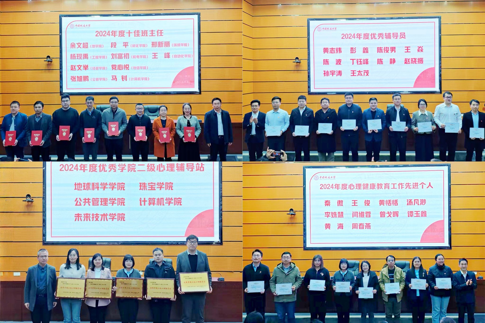 会议对获评2024年度校级“十佳班主任”“优秀辅导员”“优秀学院二级心理辅导站”“心理健康教育工作先进个人”等进行表彰,与会领导分别为获奖个人及单位颁发证书。