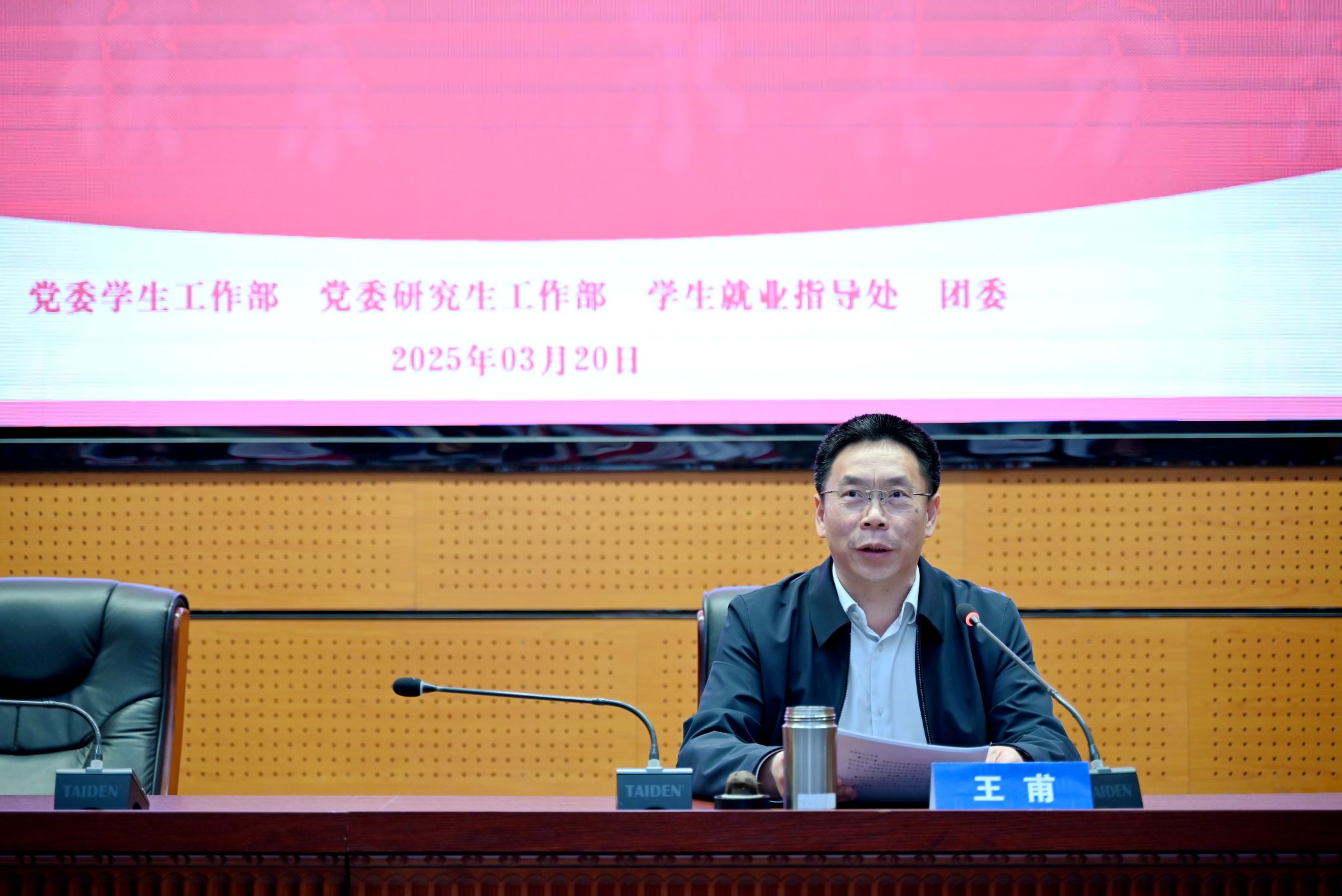 党委学生工作部、党委研究生工作部、学生就业指导处、团委负责人分别以《改革牵引实干聚能不断开创学生思政工作新局面》《党建引领把方向,导学思政聚合力,持续完善研究生党建和思政工作体系》《健全服务体系,狠抓工作落实,全力做好2025年学生就业工作》《深化改革创新,激发使命担当,不断推动共青团工作高质量发展》为题,对2025年度工作进行部署。