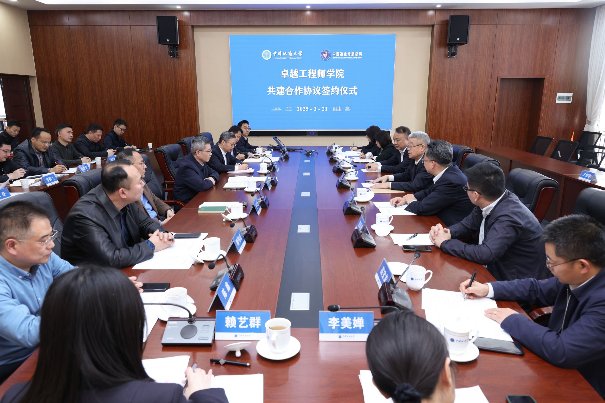 地大新闻网讯 (通讯员 孟令煊 摄影 李锐欣)3月21日,米兰与中国冶金地质总局举行座谈并签署战略矿产卓越工程师学院共建合作协议。中国冶金地质总局党委书记牛建华、局长王文军,米兰校长李建威、副校长章军锋及双方相关单位负责人参加签约仪式。章军锋主持会议。