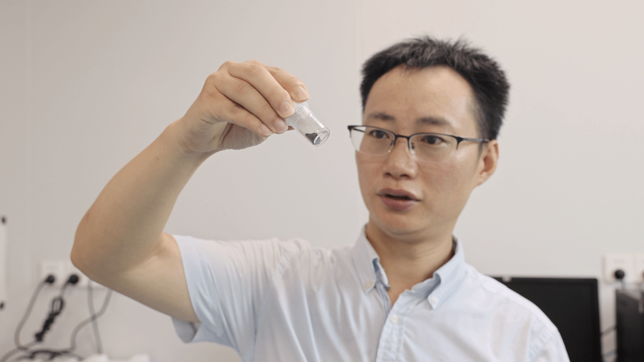 汪在聪展示嫦娥六号取回的月球背面月壤样品