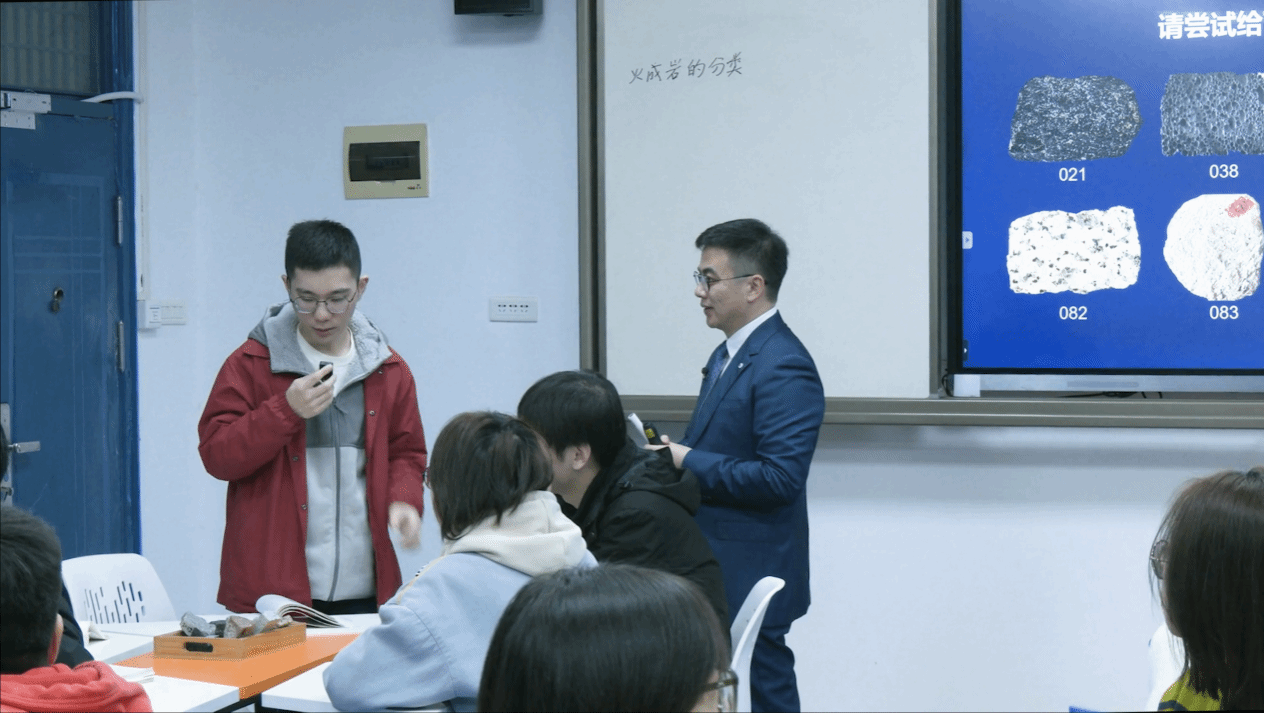 课堂上,师生借助智学地大的数字资源库,全方位、高精度观察岩石矿物标本,交流心得、共享讨论。“传统的岩矿观察需要学生跨越显微镜、标本盒、野外露头等多个尺度,现在,我们的智能平台在同一教学空间内呈现岩石标本的微观组成、手标本结构和露头构造,让学生在沉浸式学习中提升岩矿分析能力。”马强说道。