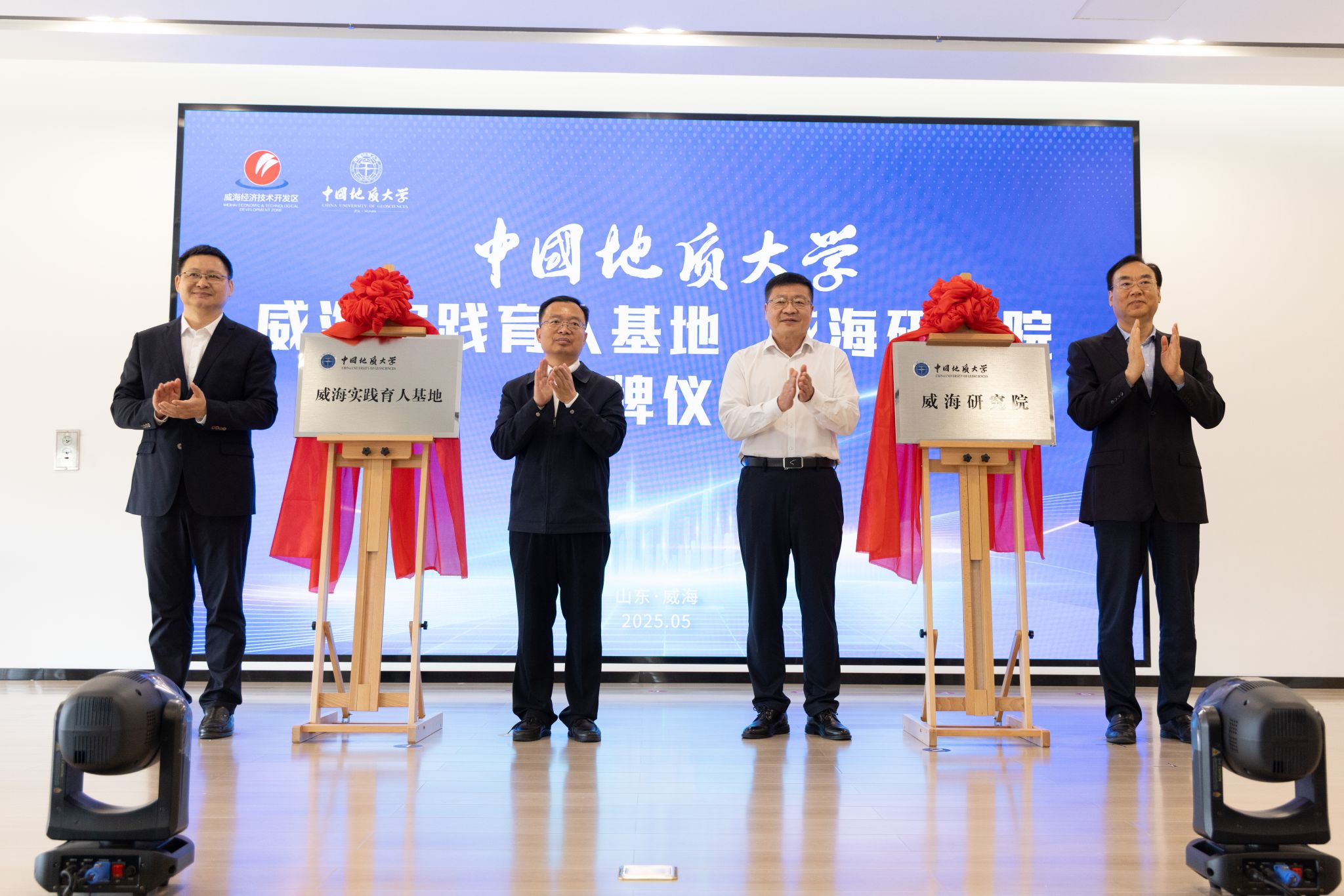米兰党委书记刘杰,山东省地质矿产勘查开发局二级巡视员韩志森,威海市委常委、组织部部长、统战部部长刘裕斌,威海经济技术开发区党工委书记、管委会主任王清等领导共同为威海实践育人基地和威海研究院揭牌。