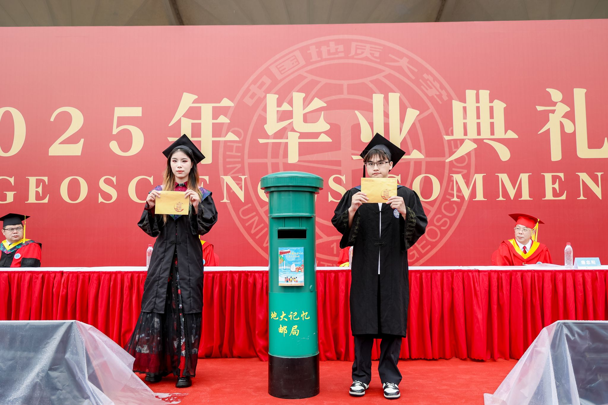 记忆邮局启动仪式环节,工程学院刘庆颖同学、公共管理学院孙艺宁同学代表毕业生投递记忆信件。毕业之际,学校在南望山校区和未来城校区的图书馆准备了“锦年信纸”与专属信封,面向全体毕业生开启“地大记忆邮局”活动。同学们可以把“珍藏南望记忆”的此刻,寄给“开启未来征程”的自己。信件将由学校档案馆分类封存进“时间胶囊”,待毕业生们返回母校时拆启。