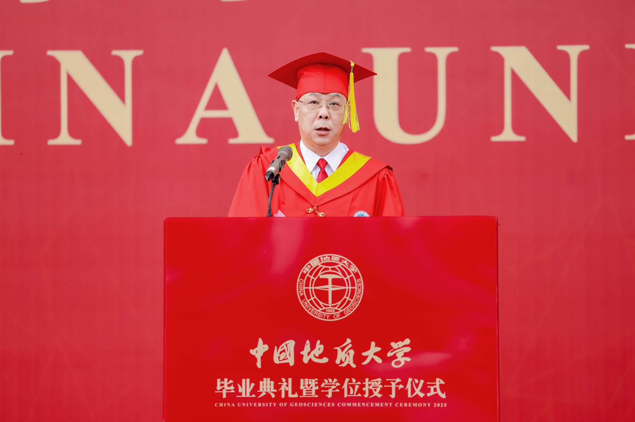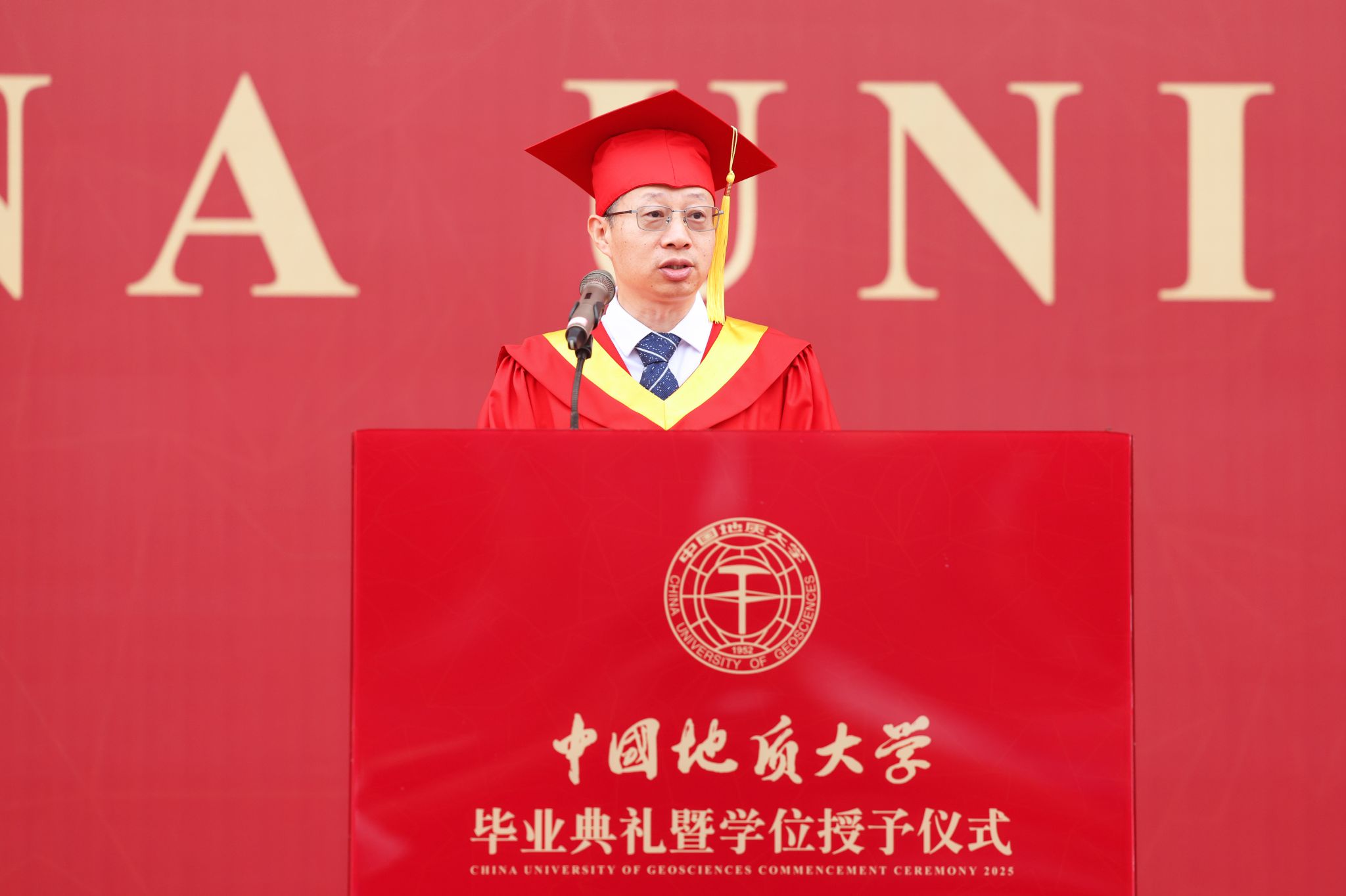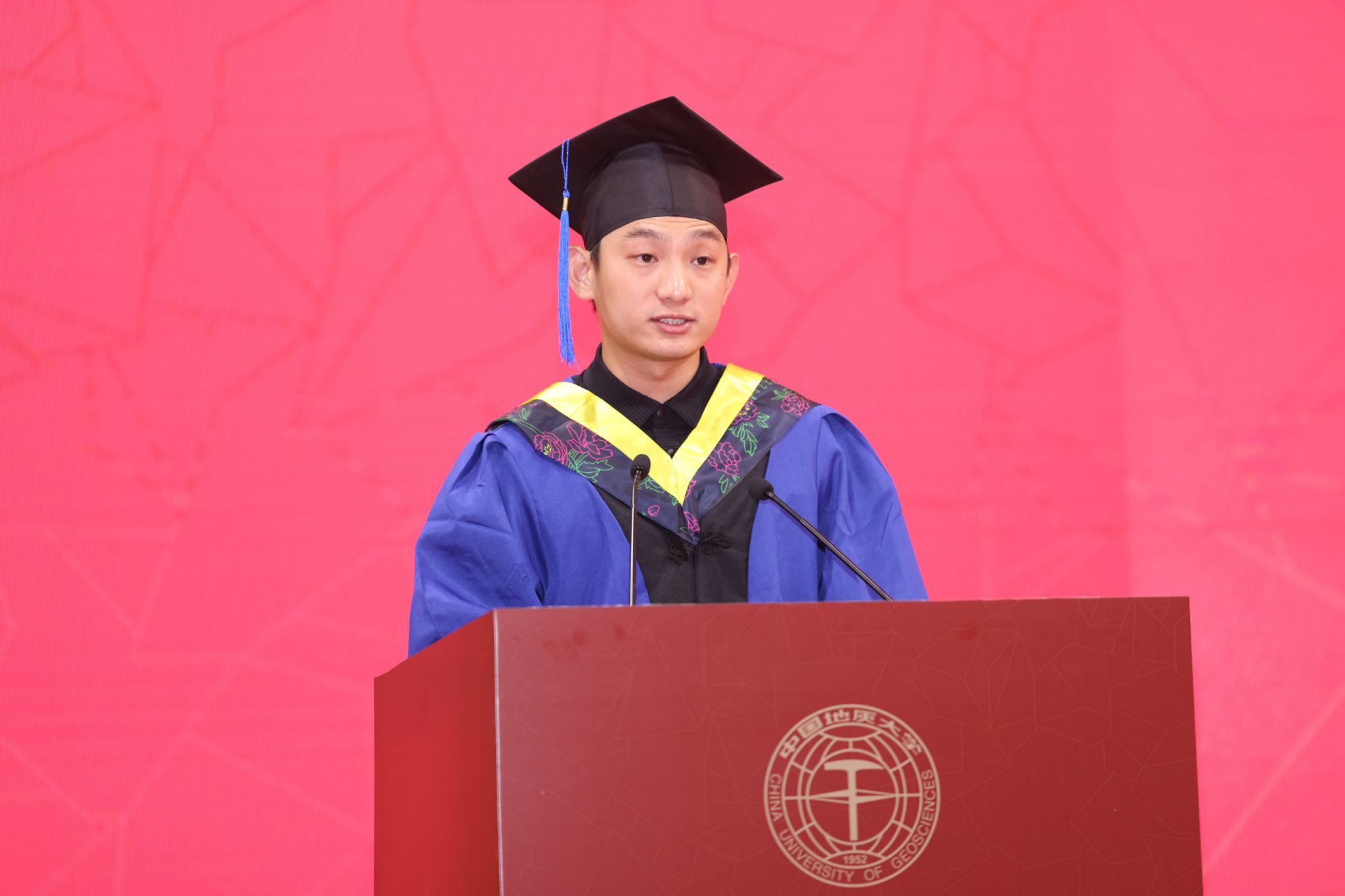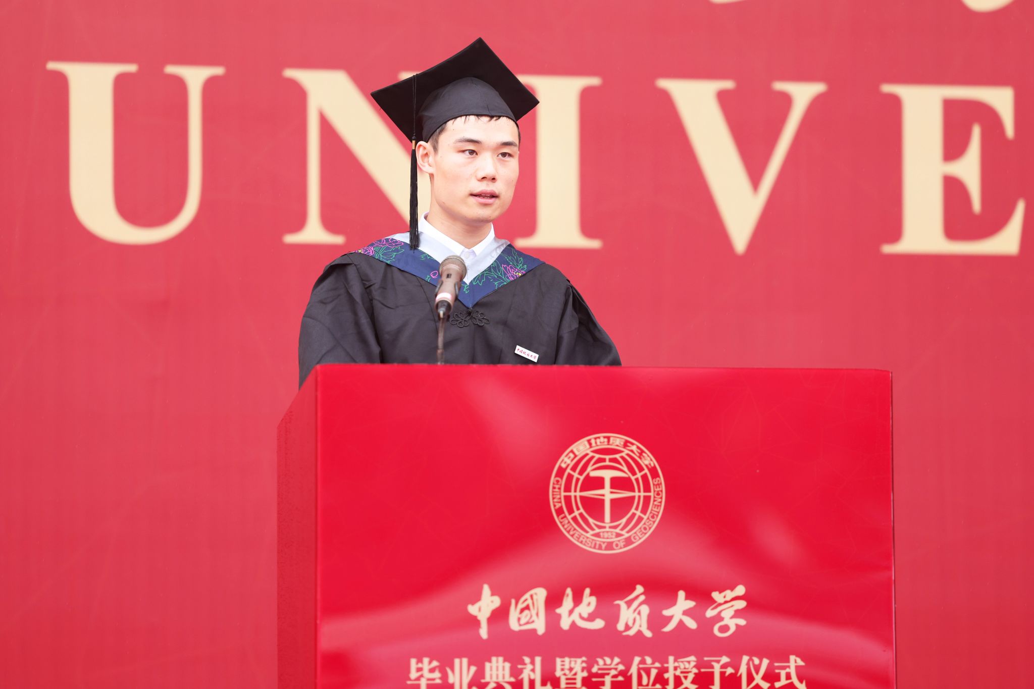 毕业本科生代表、地球科学学院珠峰班张典同学发言。他说,作为首届珠峰班成员,他在交叉融合培养模式下,通过课堂学习、科研训练以及野外实践,不仅打下了坚实的专业基础,更深刻领悟了地质人的使命情怀。他号召全体毕业生将个人理想融入时代洪流,向下扎根,向上生长,书写无愧于时代的青春答卷。