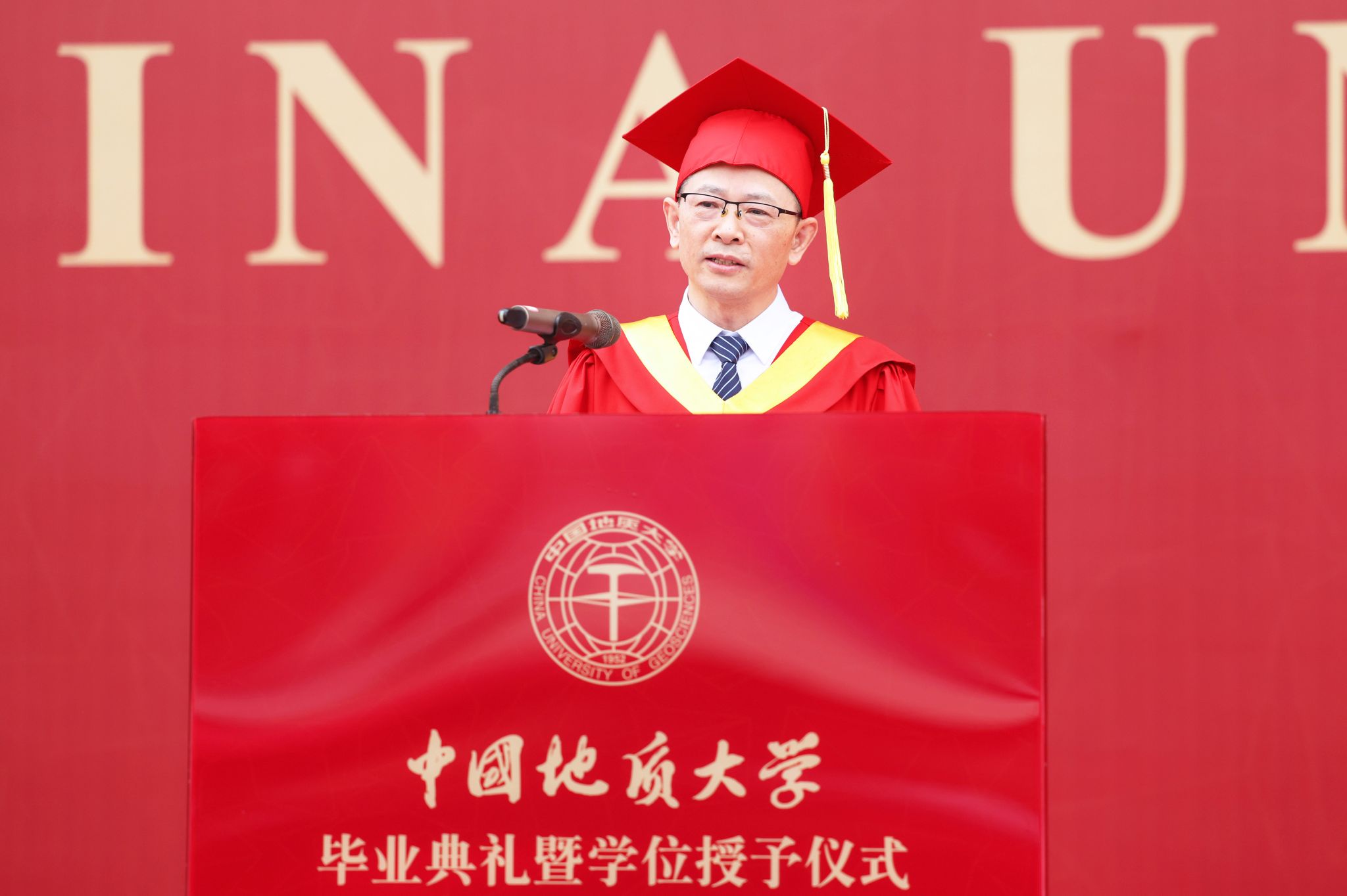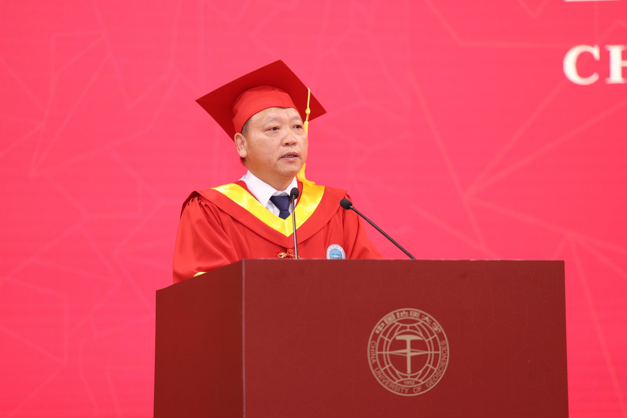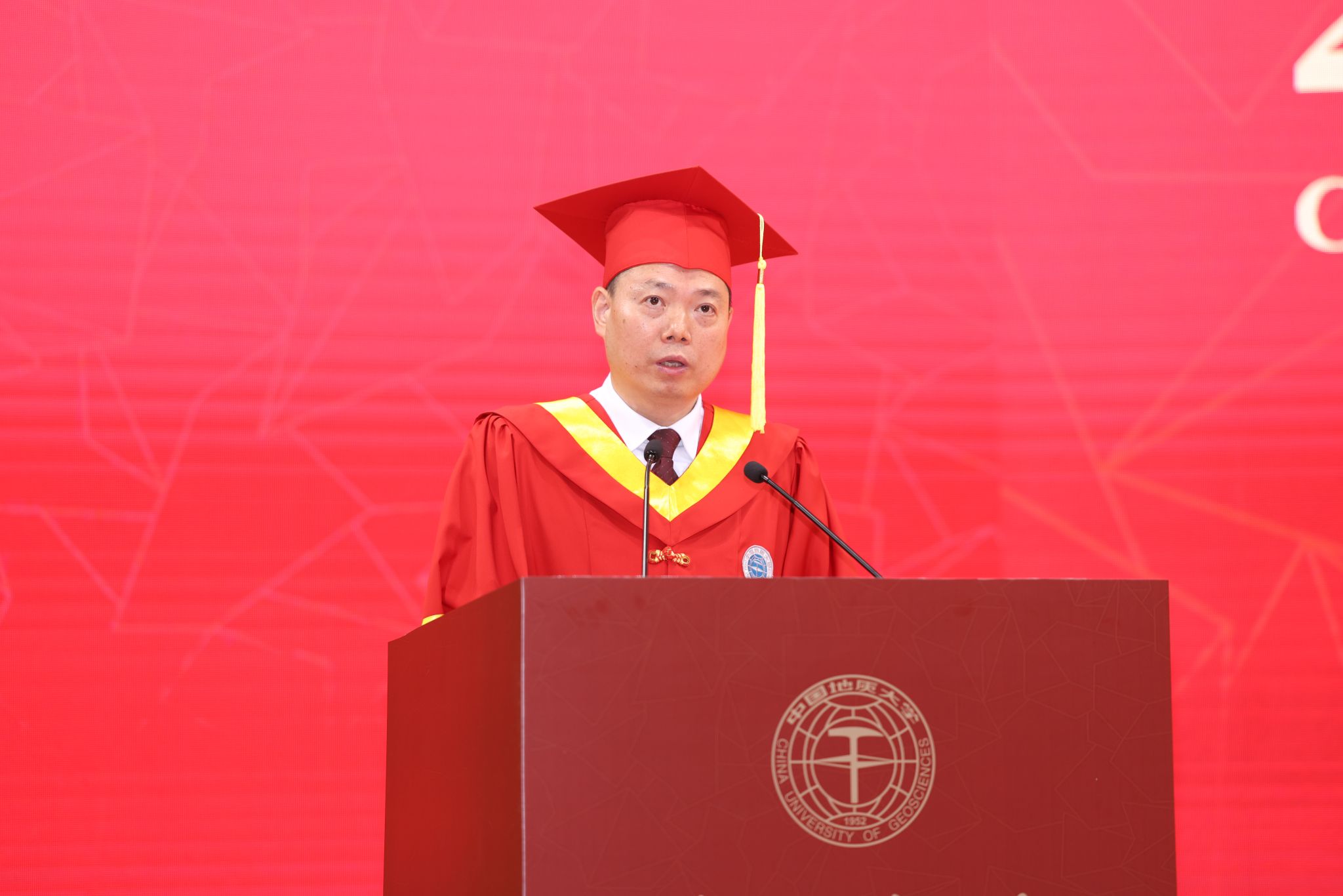 毕业本科生代表、地球科学学院珠峰班张典同学发言。他说,作为首届珠峰班成员,他在交叉融合培养模式下,通过课堂学习、科研训练以及野外实践,不仅打下了坚实的专业基础,更深刻领悟了地质人的使命情怀。他号召全体毕业生将个人理想融入时代洪流,向下扎根,向上生长,书写无愧于时代的青春答卷。