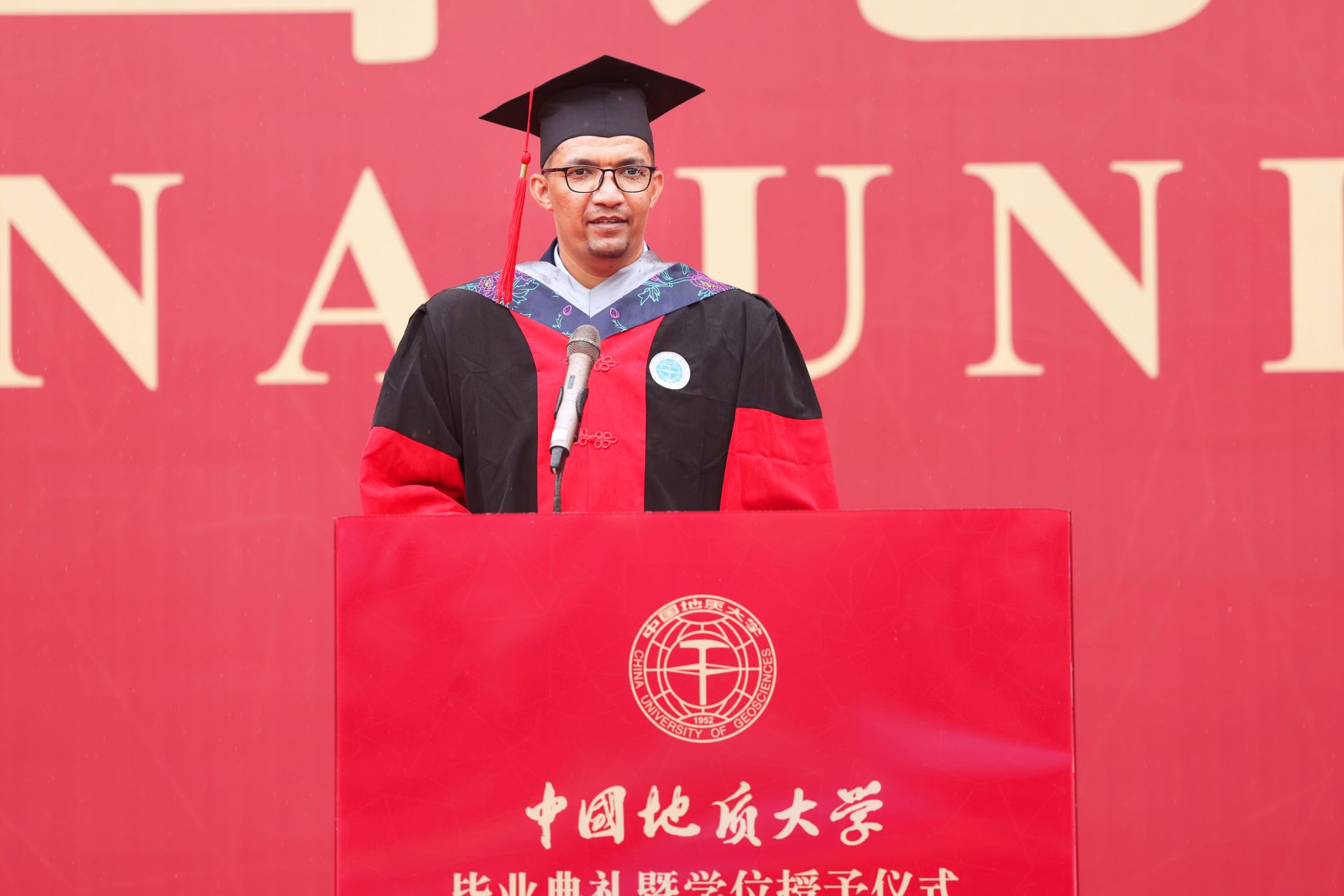 毕业留学生代表、地球物理与空间信息学院苏丹籍博士研究生路兵同学发言。作为中国为苏丹培养的首位地球物理反演博士,他的研究成功解决了苏丹油田难题。他说,在地大的11年,不仅收获了“上天入地”的专业本领,更练就了“不服周”的精神。“地大是根,中国是帆。”他将带着母校的烙印和中国的厚爱,奔赴星辰大海。
