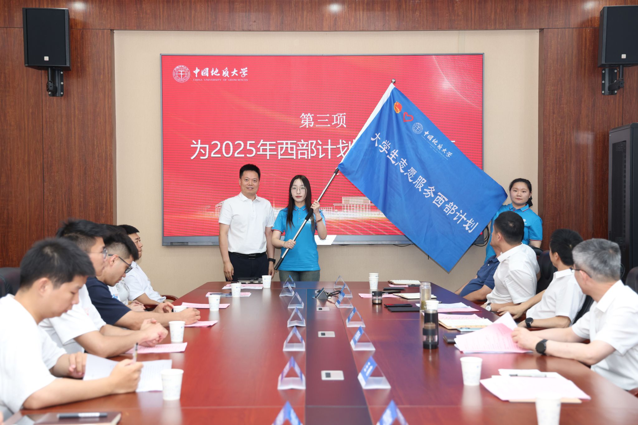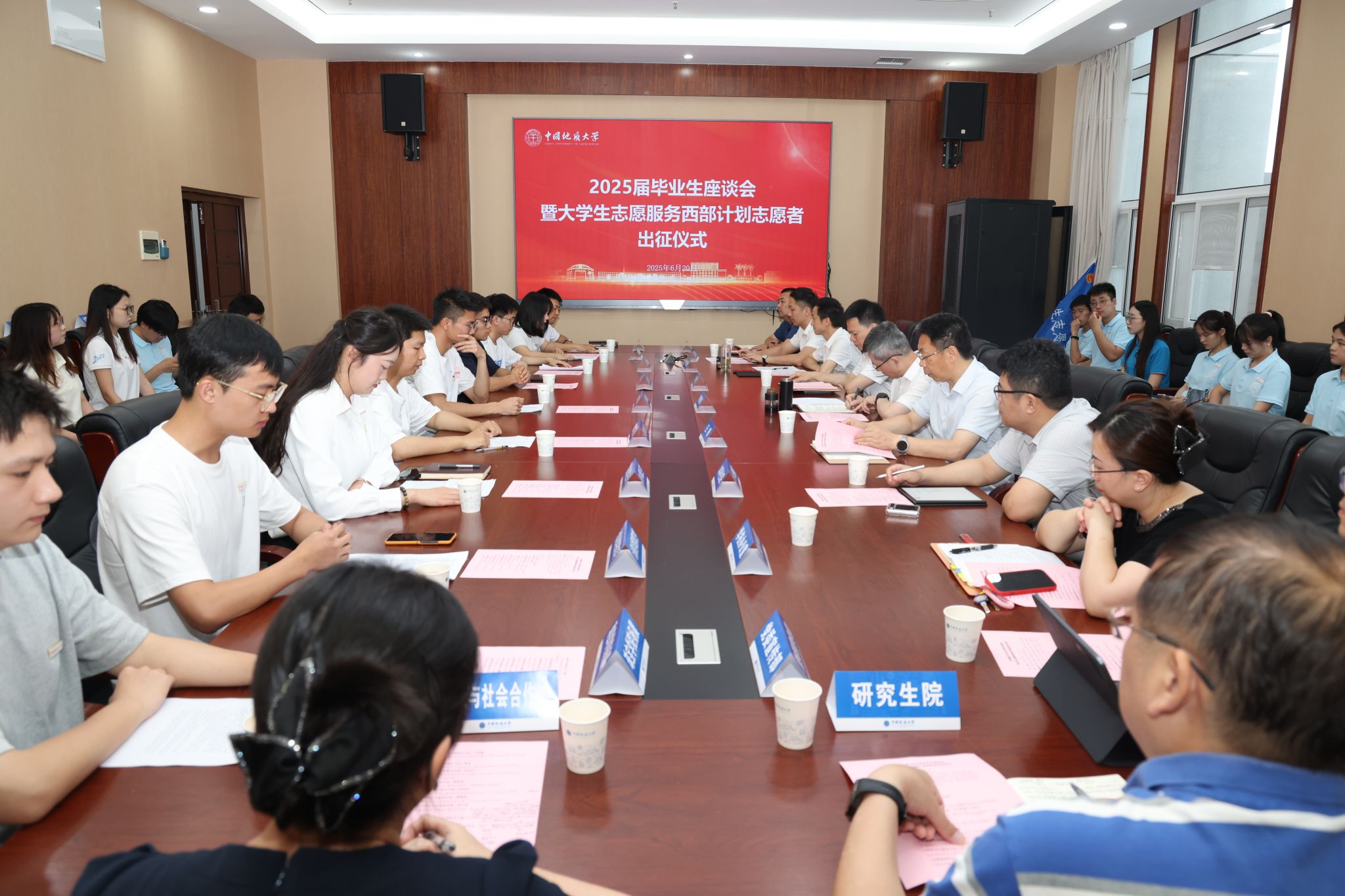 地大新闻网讯(通讯员 谢祖军 曾艺 摄影 孙彦钦)6月20日,2025届毕业生座谈会暨大学生志愿服务西部计划志愿者出征仪式在校举行。校长李建威,党委副书记王甫,副校长胡守庚,相关管理和服务单位负责人,2025届优秀毕业生代表、西部计划志愿者及第27届研究生支教团成员代表参加会议,共话青春梦想,启航崭新征程。