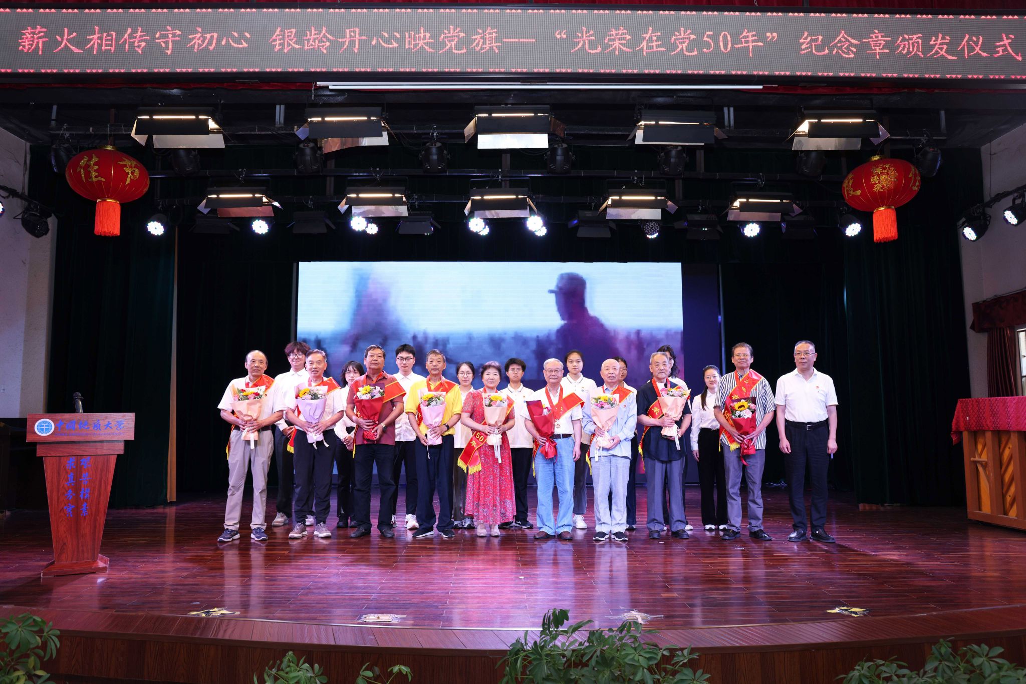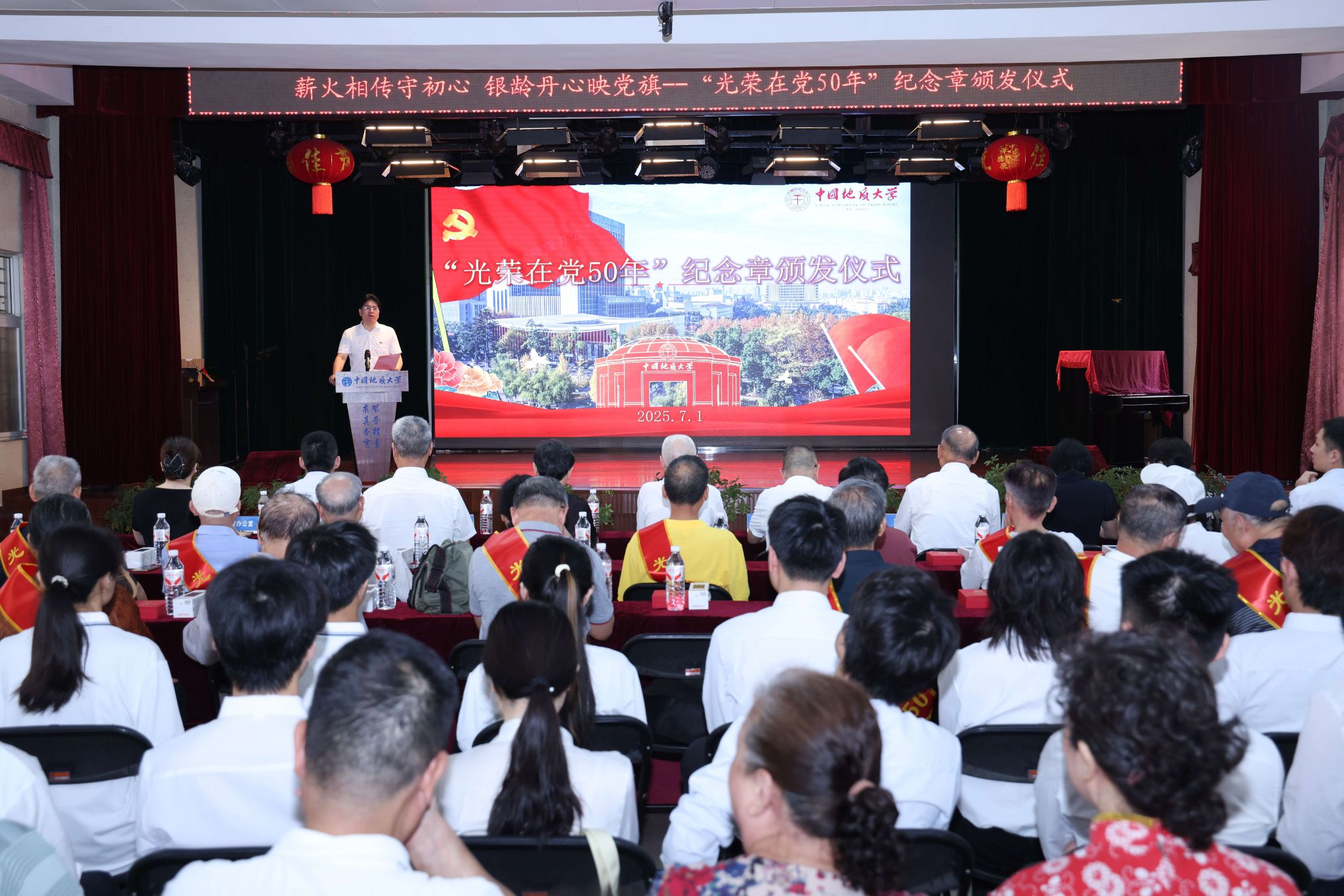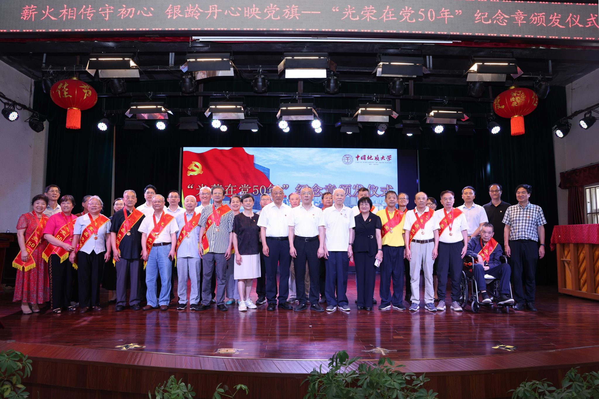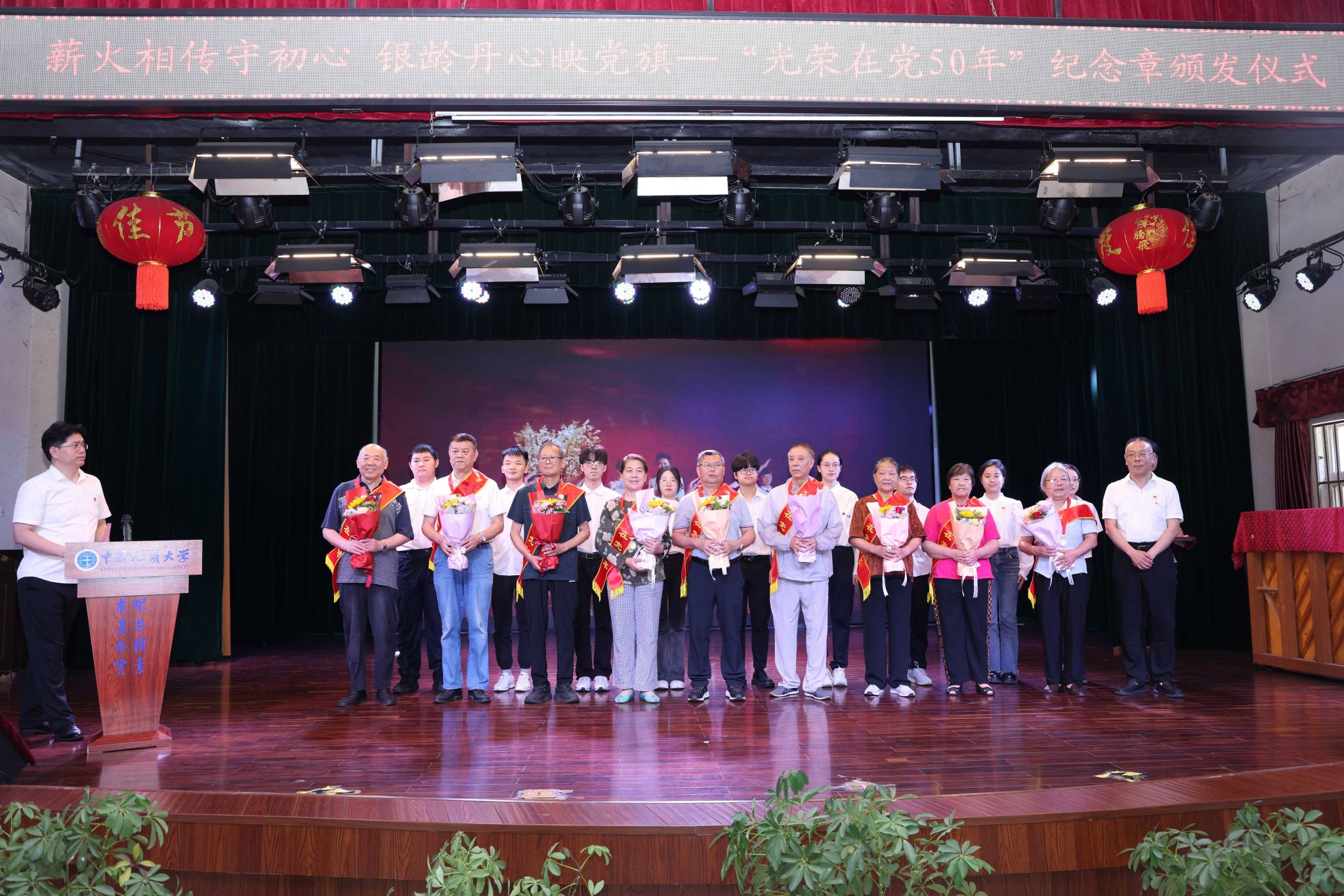 地大新闻网讯 (记者 孙彦钦 学生记者 杨小樱 通讯员 叶青)薪火相传守初心,银龄丹心映党旗。7月1日,“光荣在党50年”纪念章颁发仪式在校举行。校党委副书记唐忠阳,党委常委、组织部部长陈文武,相关职能部门负责人、老党员代表、离退休党支部书记、离退休工作党委委员、老协委员、关工委老同志委员、青年学生党员等百余人齐聚一堂,共同见证这一庄严时刻。
