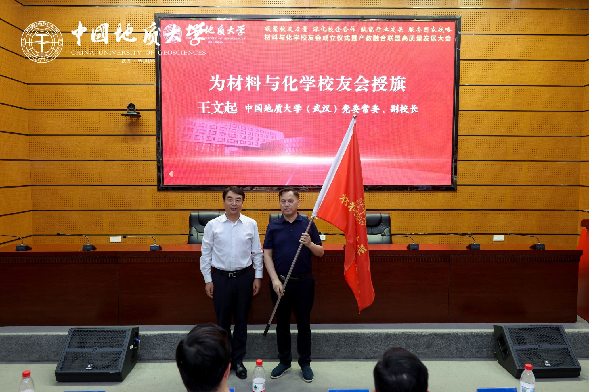 王文起代表米兰向材料与化学校友会首任会长熊友辉授旗。