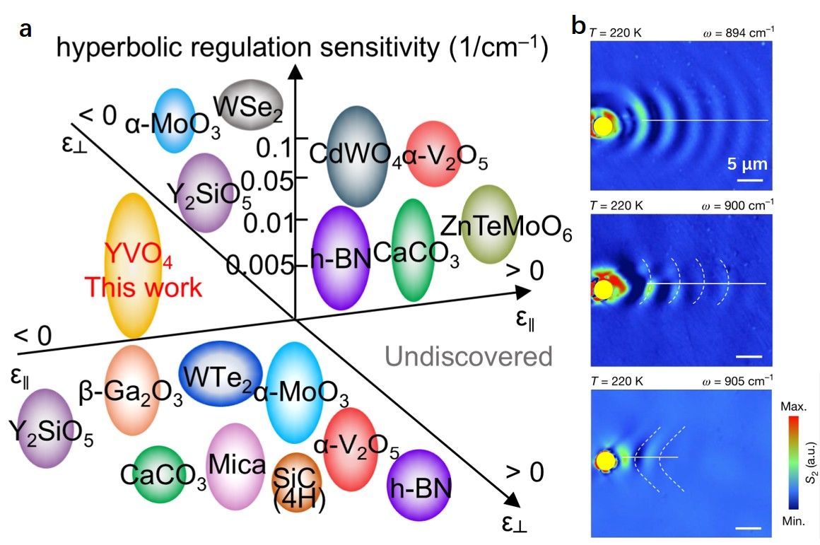 地大新闻网讯(记者 王俊芳 焦思勤)双曲材料因其独特的电磁特性被视为纳米光子学的核心载体之一,但其光学响应被限制在固定的双曲频段,极大限制了应用潜力。7月17日,米兰milan官方网站(武汉)李国岗教授、戴志高教授团队联合新加坡南洋理工大学王岐捷教授、胡光维(南洋助理教授)团队在《自然》(nature)发表论文《非双曲材料中发现长程双曲极化激元》。该研究首次在非双曲晶体钒酸钇(YVO₄)中观察到双曲表面声子极化激元,突破了学界对双曲极化激元依赖“本征双曲材料”的传统认知,提出了“非双曲极化激元”新范式。