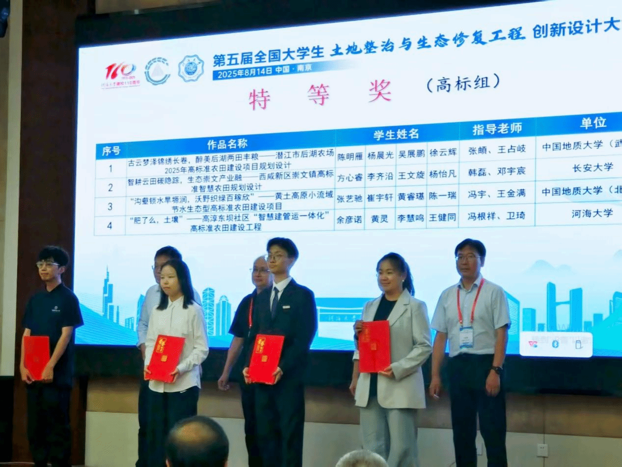 地大新闻网讯(通讯员 陈明雁 张頔)近日,第五届全国大学生土地整治与生态修复工程创新设计大赛决赛在江苏南京举行。来自全国30余所高校的108支队伍同台竞技。由米兰公共管理学院本科生组成的沃土先锋队完成的作品《古云梦泽锦绣长卷,醉美后湖两田丰粮——潜江市后湖农场2025年高标准农田建设项目规划设计》荣获大赛特等奖,指导老师张頔老师和王占岐教授获优秀指导教师奖。