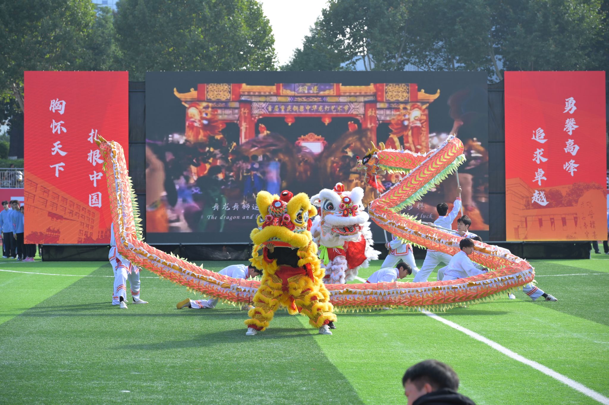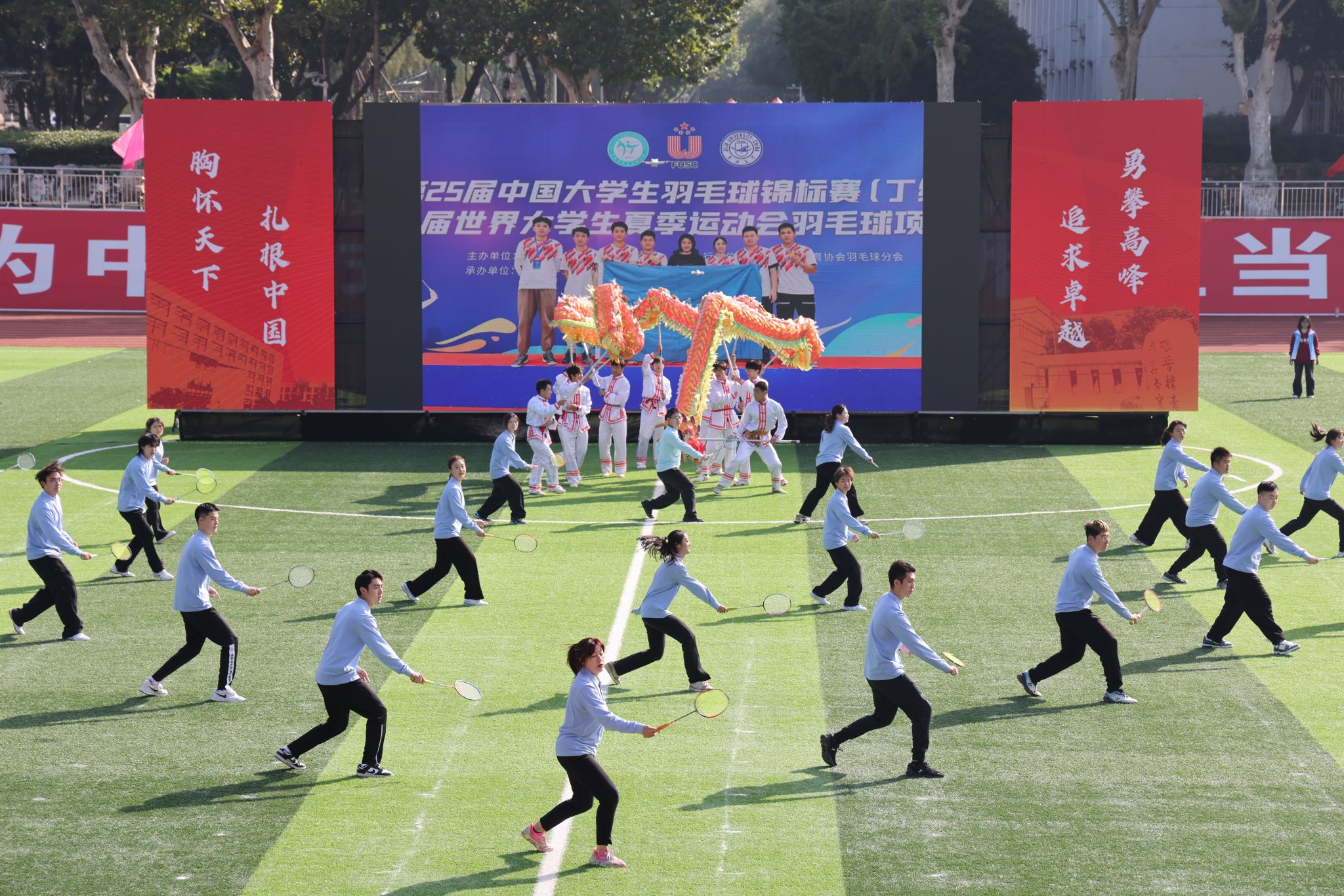鼓点铿锵,旌旗飞扬,学校羽毛球队与龙狮队共同带来《羽你同行,龙舞飞扬》。龙狮队队员们身手矫健、配合默契,巨龙昂首摆尾,雄狮腾挪闪转,以刚柔并济的表演,展现了力与美的融合,传递出吉祥与活力的美好寓意。羽毛球队在功勋教练邹师思引领下带来原创健身操,多年来球队不仅培养了高凌、王懿律、黄雅琼、郑思维等多位奥运冠军,更在国际赛事中屡获佳绩,以卓越战绩彰显地大体育的深厚底蕴与硬核实力。