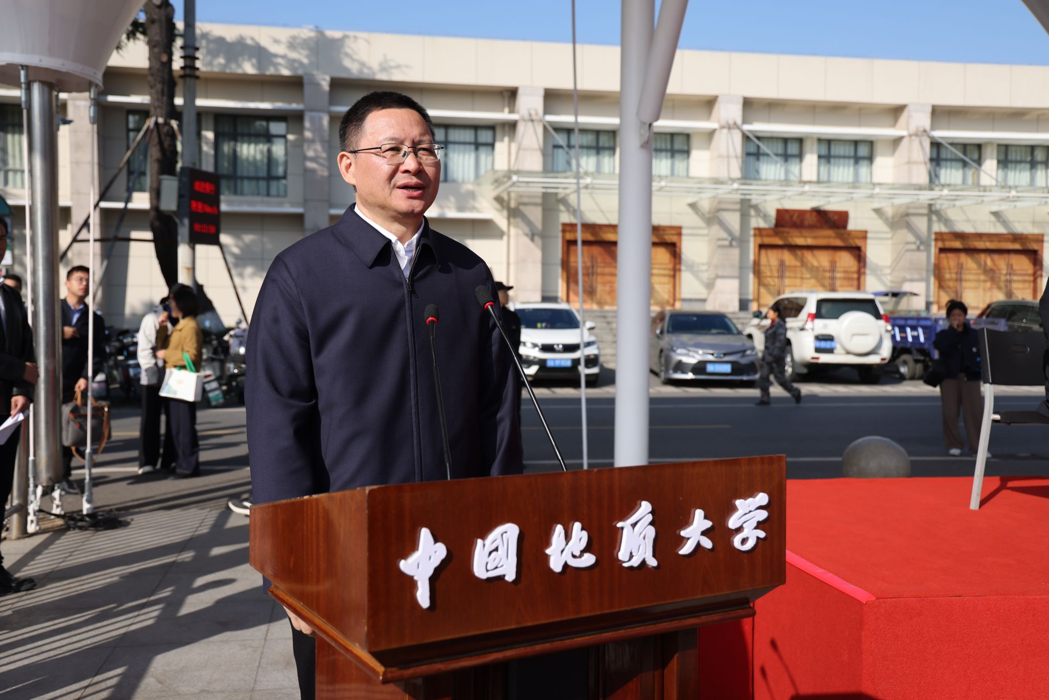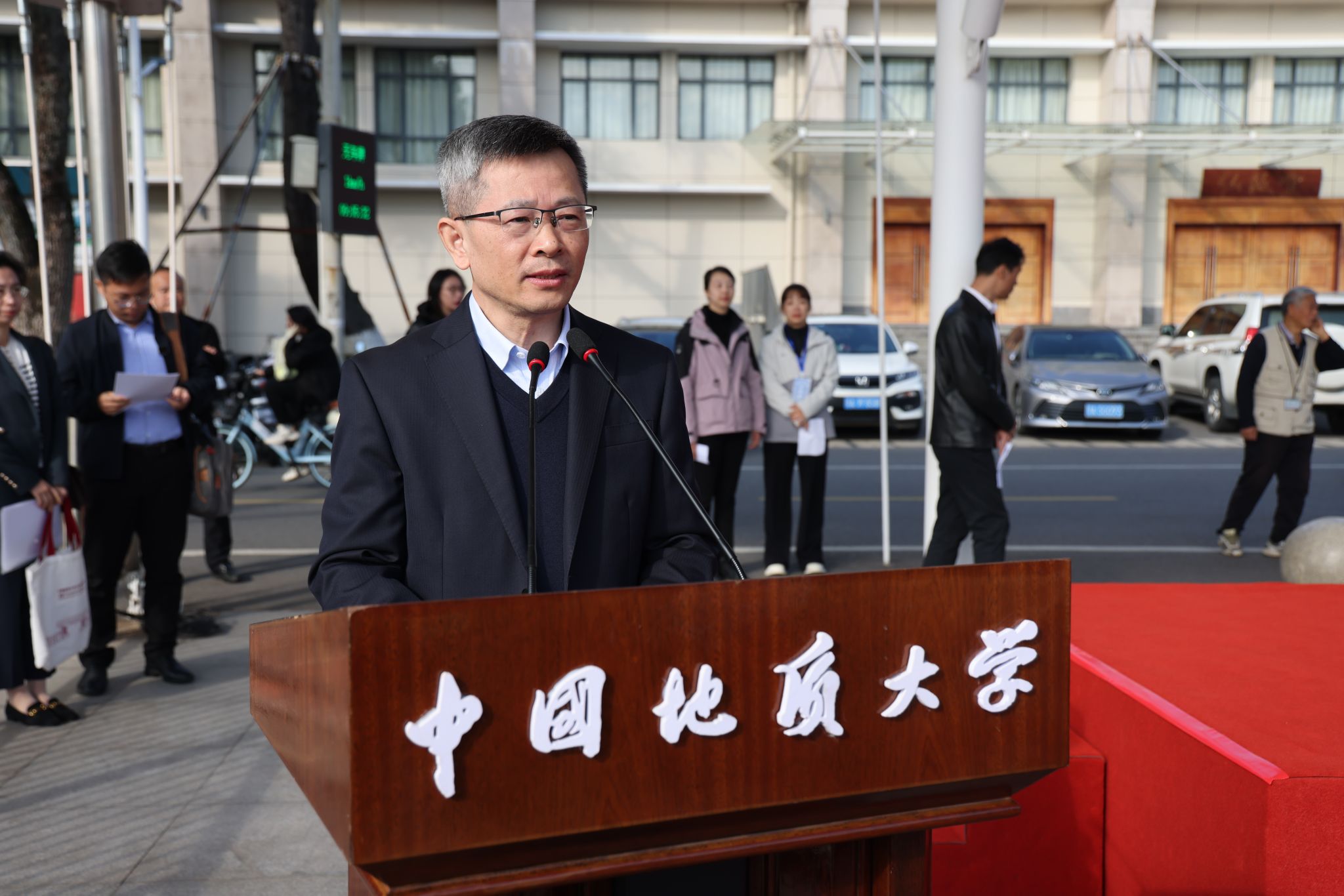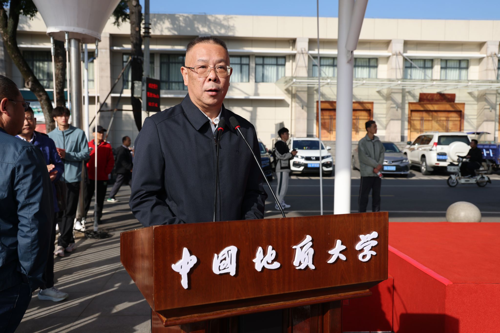 校长李建威致辞。他指出,学校始终将体育运动与事业发展紧密结合,形成了以登山、攀岩为特色的体育传统,“为国攀登”的精神已融入地大人的血脉,并延伸至“上天入地、下海登极”的各个科研领域。学校坚持服务“体育强国”“健康中国”战略,积极推动群众体育与专业体育共同发展,营造了浓厚的校园体育文化氛围,并在国内外赛场上成绩斐然。他号召,师生以运动会为新起点,弘扬奥林匹克精神,将赛场上的拼搏、协作与进取精神,转化为推动学校发展的强劲动力,为建设地球科学领域世界一流大学奋勇前进。