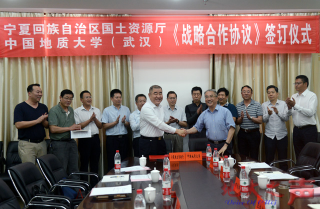 韦晓龙介绍了战略合作协议框架,王焰新、王政代表双方在协议书上签字。根据协议,双方将本着“相互支持、优势互补、互惠互利、长期合作、共同发展”的原则,发挥各自优势,实现优势互补,共同组织完成宁夏“深化土地改革专题研讨班”,共同组织完成《宁夏回族自治区地质环境保护条例》和《宁夏回族自治区矿山地质环境治理与恢复标准》调研和起草工作,启动《宁夏回族自治区国土规划》研究工作,在人才培养、科研攻关、智库建设等方面开展深度合作。