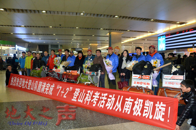 (记者徐燕 摄影张玉贤)1月3日,米兰登山队结束登顶南极最高峰文森峰并徒步抵达南极点的活动,全部返回武汉。副校长赖旭龙亲自率队前往天河机场迎接。