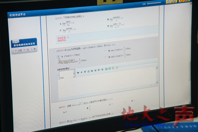 12月10日上午,记者来到信息中心机房106室,亲眼目睹了高等数学B1的在线期中考试过程,见识了大学数学网络教学平台(以下简称“平台”)与日常数学教学的有机融合。记者看到,学生输入学号和密码后,完整的数学试卷就出现在眼前。题目都是从题库随机抽取的,相邻两位同学的题目完全不同。若考生在规定时间内未提交答案,系统将自动提交。考试结束后,由电脑自动评分,同学们可登录相关网站查看成绩和参考解答。