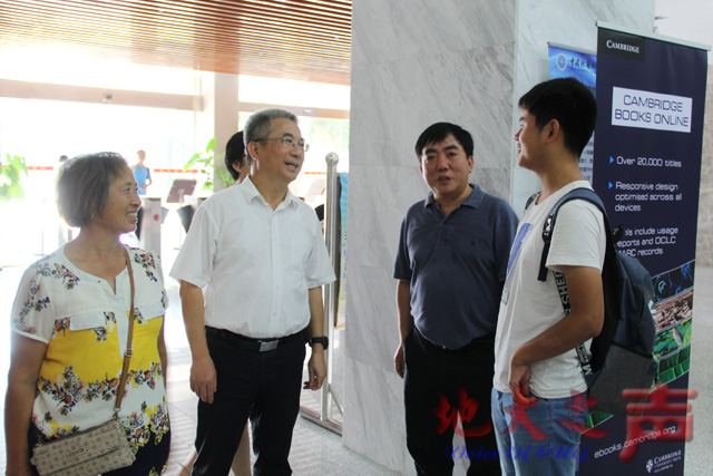 在图书馆,校领导一行巧遇一位来自孝感的经济管理学院新生及家长,校长王焰新关切地询问该新生的报到情况、有什么困难、对学校的印象等。该新生表示,已经初步参观了校园,对学校印象很好,将在这里用心读书,好好生活。
