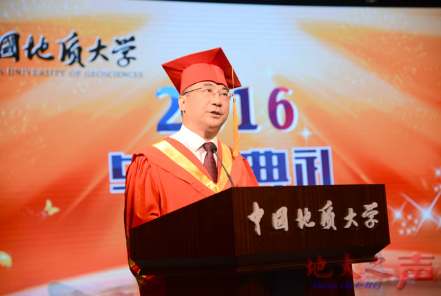 作为老师和朋友,他向即将告别学校、告别老师、告别同学,独自走向纷繁复杂社会的同学们送出了“为公、修己”两个词。他说:“‘为公’是胸怀天下之志、勇于担当之风、敬业奉献之品、甘心吃亏之智。‘修己’是勤学以增智、躬行以立德、自省以正品。”他以校友温家宝总理、欧阳自远院士和高山教授的实例告诫每一个即将走出校门的地大学子:要时刻保持一颗为公之心,面对乱象和恶习,有责任担当起为国尽责、为民奉献的使命,有义务用自己的言论去守望知识分子的清高,用行动去捍卫知识分子的尊严;要永不停歇修己之旅,保持地大人务实的作风,求真的品质,在坚守和奋斗中砥砺成才。