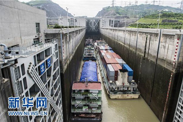 2015年6月22日,船舶通过三峡双线五级船闸上行。当年5月,三峡船闸和葛洲坝船闸通过货运量双双破千万吨。新华社发(郑家裕摄)