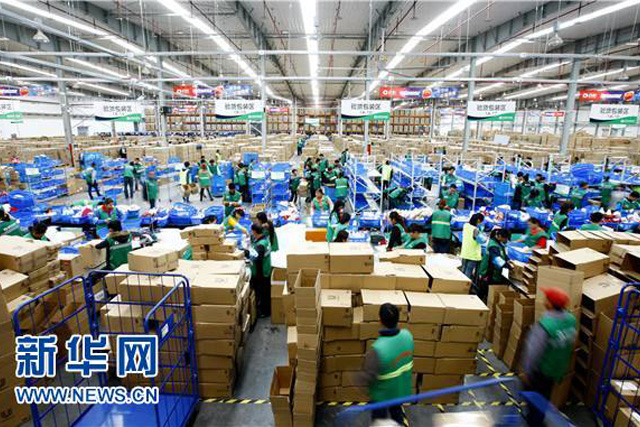 2015年11月11日,百世汇通上海一号仓储运分拣中心全景。当日凌晨,一年一度的“双十一”网络购物节正式拉开序幕。新华社记者 方喆摄