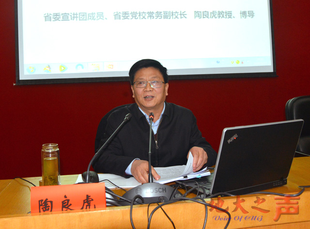 陶良虎以《践行五大发展 率先建成小康》为题作报告。他说,省委十届七次全会,是我省在深入推进“五个湖北”建设,加快“建成支点、走在前列”进程的关键时期召开的一次承前启后、继往开来的会议。会议通过的《中共湖北省委关于制定全省国民经济和社会发展第十三个五年规划的建议》,是此次省委全会通过的重大成果,是我省率先全面建成小康社会的行动纲领。他着重围绕深刻认识“十三五”时期湖北发展的阶段性特征、准确把握“十三五”时期湖北发展的总体思路、全面落实“十三五”时期湖北发展的工作任务和重大举措、切实提高党领导经济社会发展的能力和水平等四个方面,对省委十届七次全会精神进行了深刻、全面、系统的解读。他指出,这次全会作出了“十三五”时期是湖北大有可为的黄金机遇期的重大判断,我们务必保持良好精神状态,抢抓机遇,锐意进取,以更大的定力谋发展、促发展,以更生动的实践为全省“十三五”战略目标的实现、为湖北加快“建成支点、走在前列”作出新的贡献。