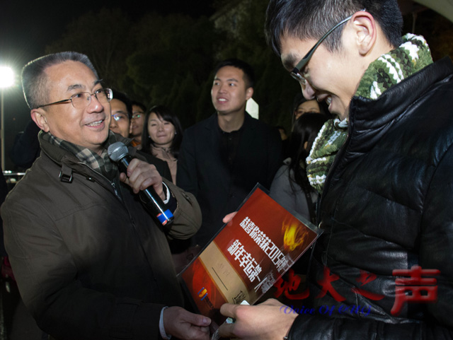 王焰新亲自组织新年第一人抽奖,在焦急而兴奋的等待中,大屏幕上的学生学号定格,机械与电子信息学院的大四学生钟剑文荣获此奖,获得价值6000元的联想电脑。
